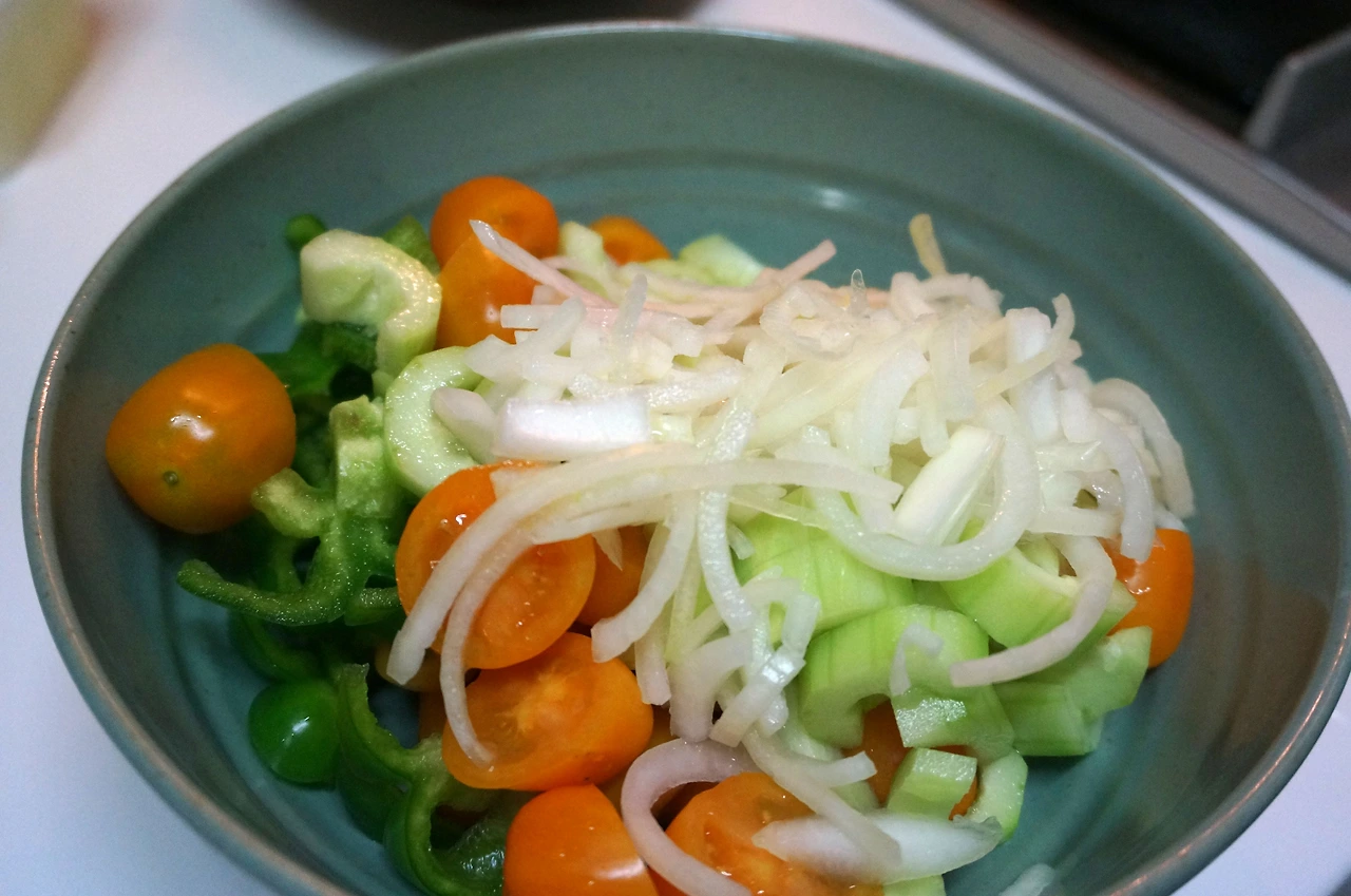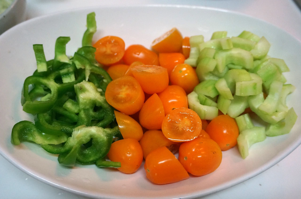 기왕 만드는 김에 빨간 토마토도 섞어서 알록달록하게 만들어볼걸 하는 아쉬움도 든다. 하지만 그러기엔 방울 토마토가 너무 비쌌다. 저것도 랩이 조금 뜯겨 할인하는 것을 3500원에 싸게 산 것이다. 항상 생각하는 것이지만, 한창 싸서 한 통에 2000원 정도 하는 철이 아니라면 방울토마토는 자취생에게 좀 사치스러운 채소이다.
