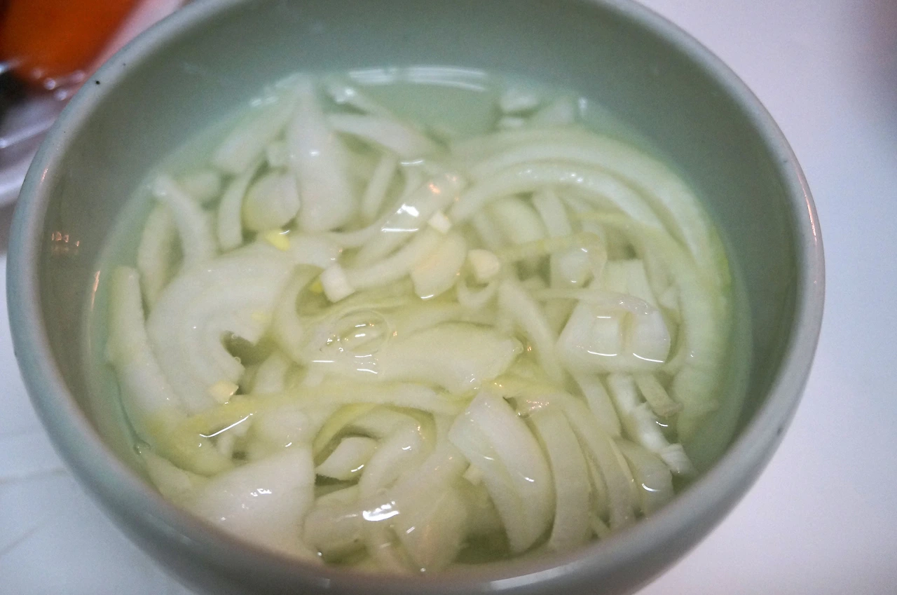 1) 양파는 채썰어서 식초를 세 스푼쯤 섞은 물에 자작하니 담아서 매운맛을 뺀다.
