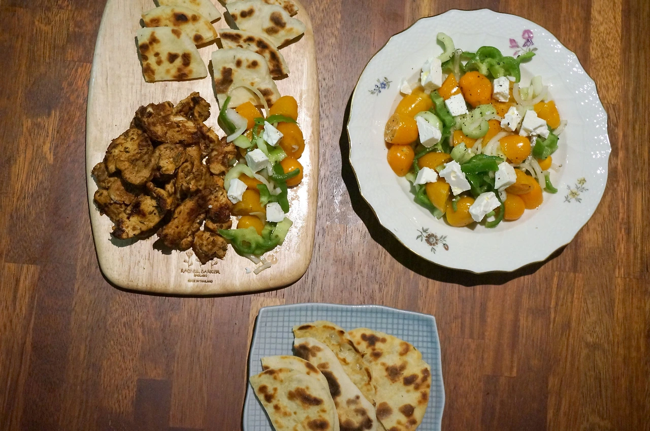 그리스식 곁들이 빵, 피타 브레드와 치킨 기로에 곁들여 먹었다. 향신료향이 가득한 바삭하면서도 부드러운 닭고기와 담백하고 노릇노릇한 빵, 상큼한 샐러드의 조화는 가히 삼합이라고 부를 만하다.