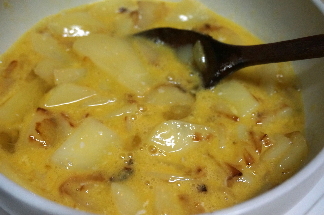 6)감자가 살짝 갈색빛이 돌 정도로 익었다면, 올리브유+양파 +감자를 팬에서 꺼내 바로 달걀을 풀어둔 볼에 옮겨담는다. 달걀이 잔열에 급하게 익지 않도록 1분 정도 살살 잘 저어준다. 감자와 양파의 잔열로 달걀을 점성이 있는 액체 상태가 되도록 천천히 익히는 것이다.