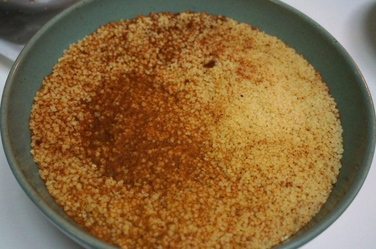 1) 큰 볼에 쿠스쿠스 250g을 넣고 소금 후추 넉넉히, 파프리카 가루, 큐민 가수를 1 티스푼을 넣는다.