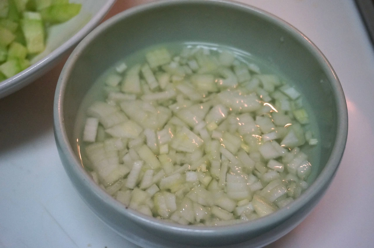 3) 쿠스쿠스가 부풀기를 기다리는 사이 채소(토카토, 청피망, 오이, 양파)를 다듬는다. 작은 큐브 모양이 되도록 썬다.