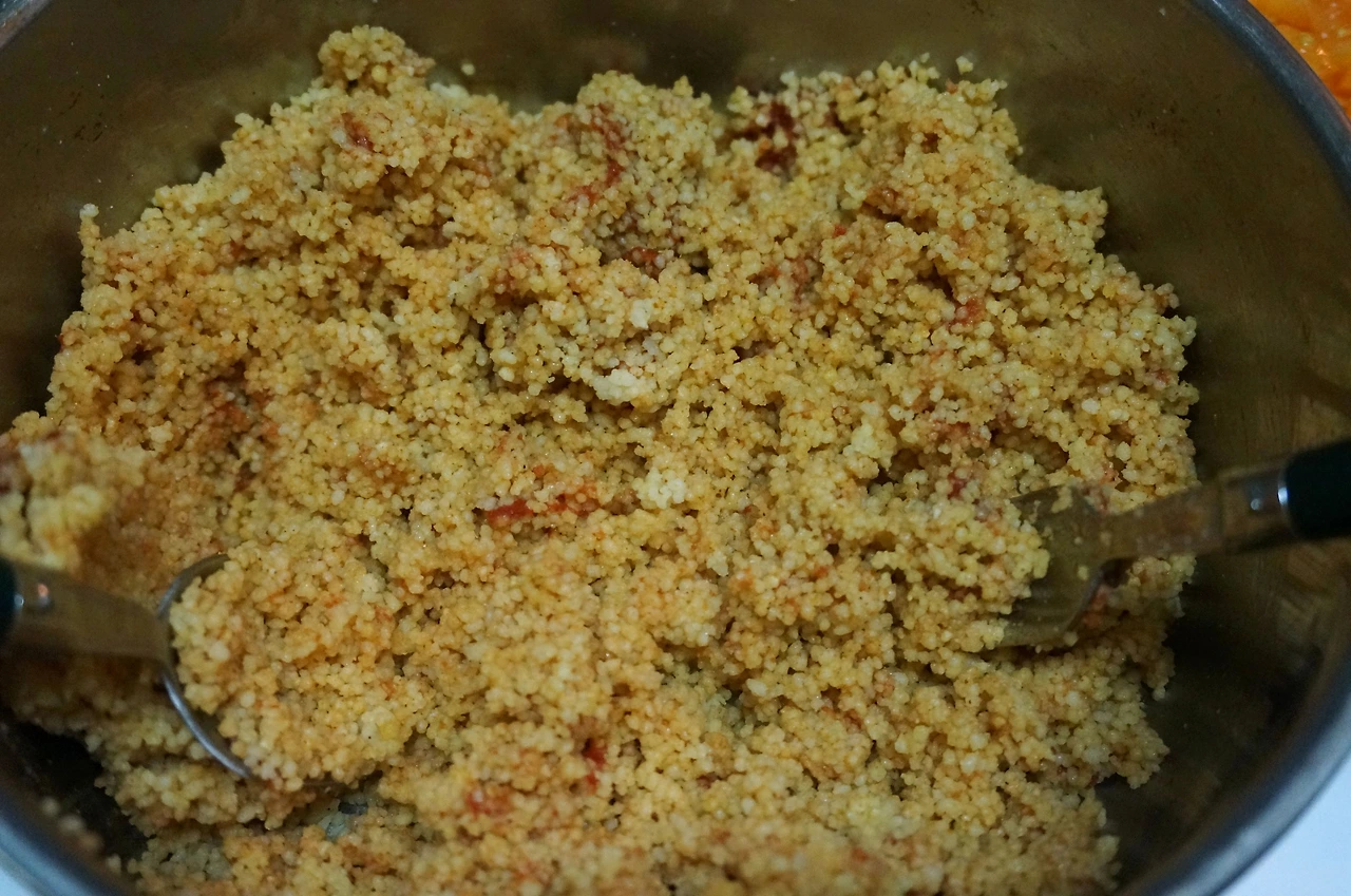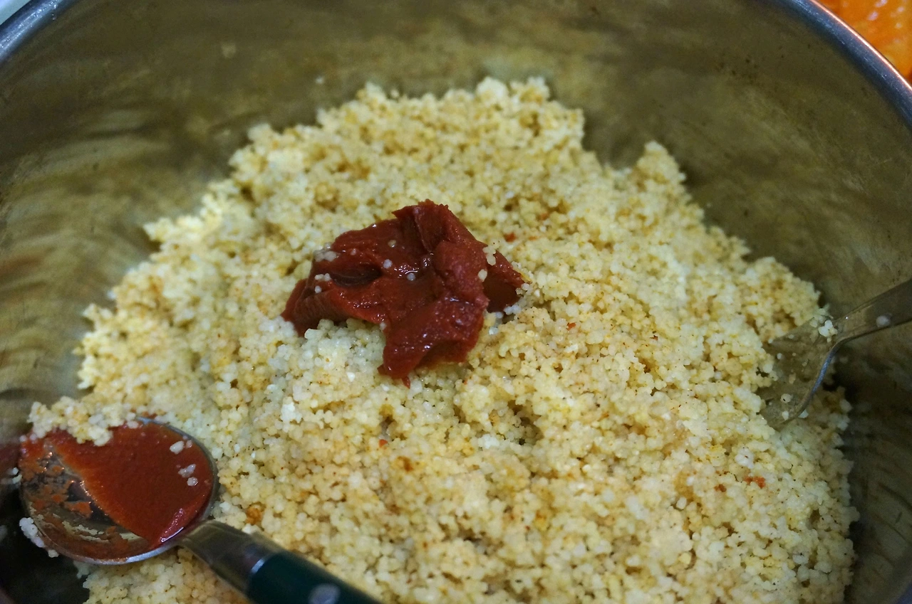 5) (4)의 쿠스쿠스에 토마토 페이스트를 한 스푼 추가하여 새콤한 맛을 더한다.