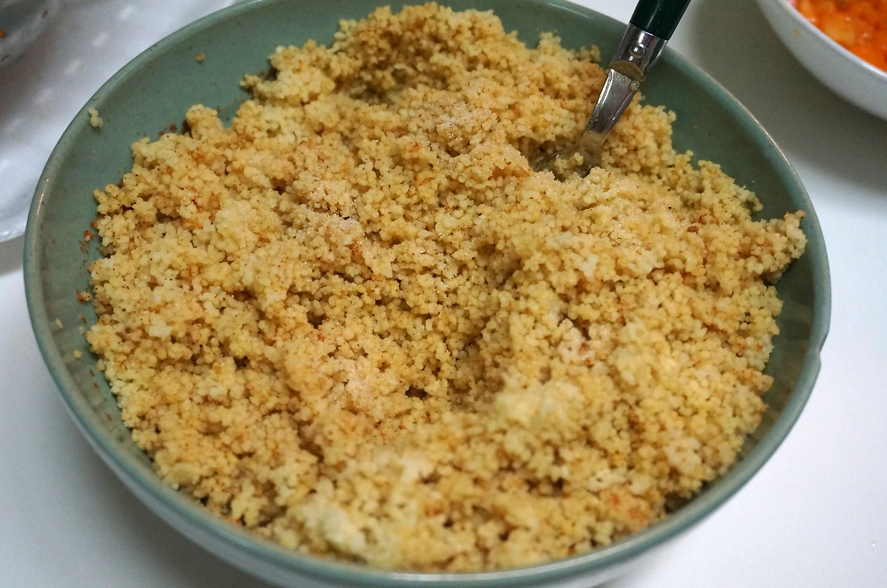 쿠스쿠스가 크게 부풀 것이므로 넉넉하게 큰 볼을 사용해야 한다.