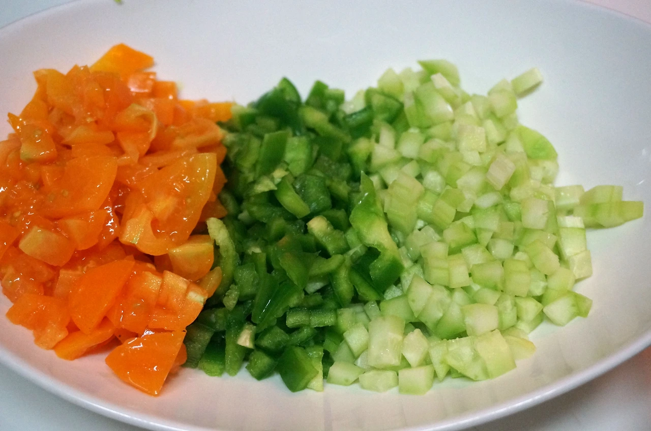 -오이 1 줄, 토마토 적당히, 청피망 하나, 양파 반 알~한 알: 양파는 맛이 순한 붉은 양파가 더 잘 어울린다.