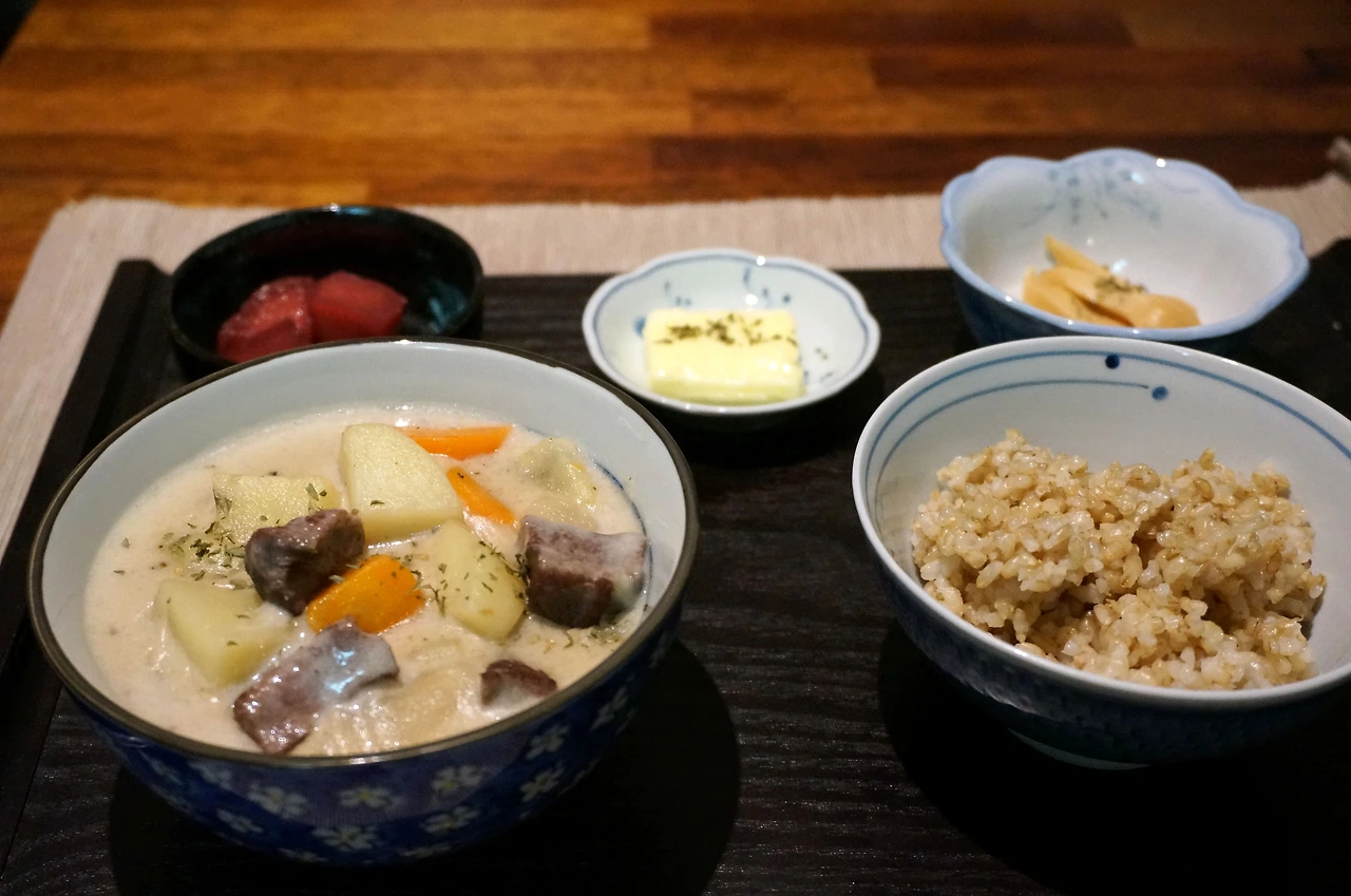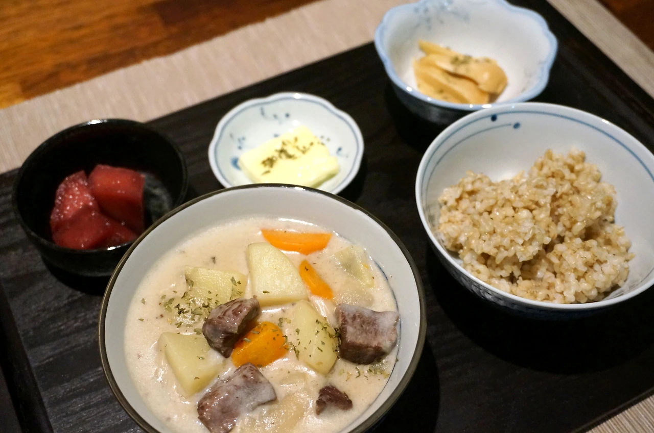 크림 스튜는 분명 서양요리에 가까운데, 이렇게 일본 식기에 담아 밥과 반찬을 곁들여도 잘 어울려 든다는 사실이 이채롭다. 일본인들이 크림스튜를 즐겨먹는 장면을 매체를 통해 몇 번 접해서일까?