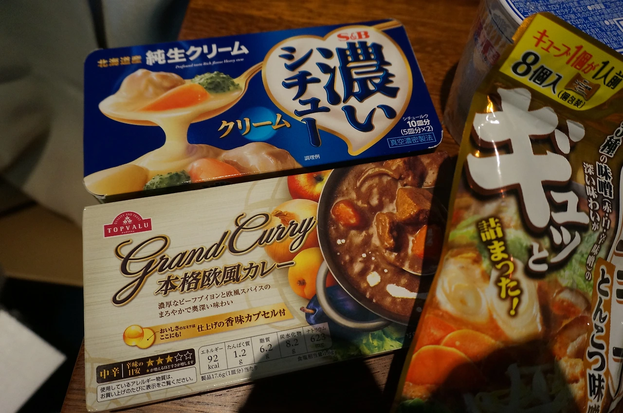 -고형 카레: 한국에서도 일본 고형 카레는 찾아보기 쉽지만 특정 브랜드 제품만 보이는 경향이 있다. 실제로 한국에서 주로 보는 브랜드 외에도 정말 많은 브랜드에서 다양한 고형 카레 제품을 저렴한 가격에 판매하고 있었다.
