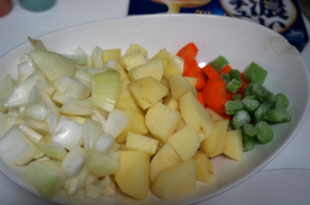 오늘 도전한 요리는 '비프 크림스튜'이다. 맥스 밸류에서 산 고형 크림스튜 소스를 사용하기로 했다. 실제로 사용해보니 '루(roux, 버터와 밀가루, 우유로 만드는 화이트소스)'와 약간의 염분, 다시다 맛이 짬뽕된 느낌의 재료였다. 요런 인스턴트 재료가 없다고 해도 충분히 버터, 밀가루, 우유만 있으면 크림스튜를 만들 수 있을 것 같다.