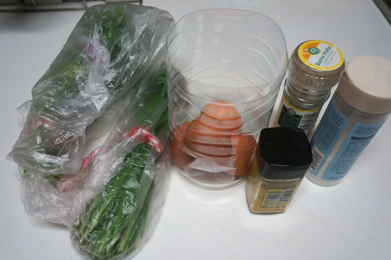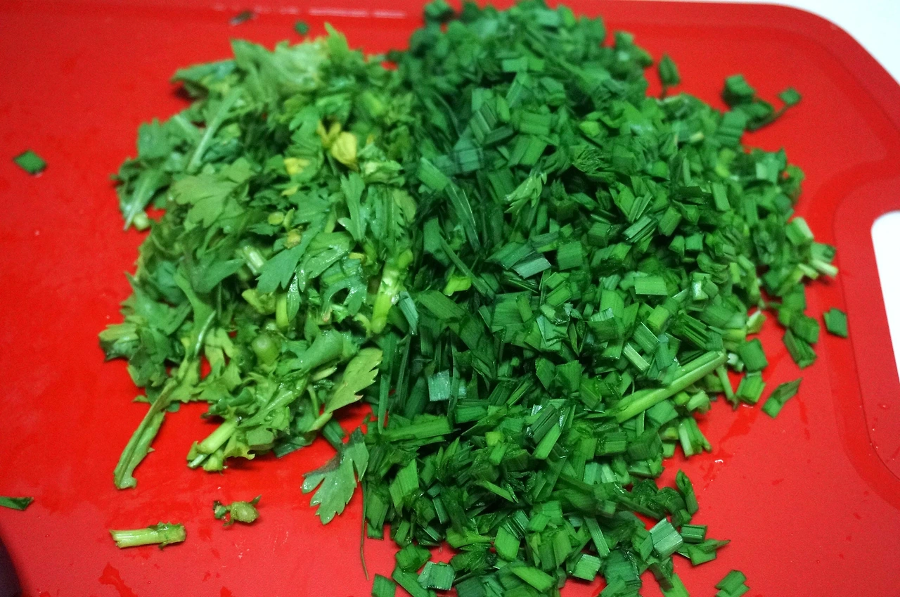 -부추, 파슬리, 딜, 고수 등의 생허브 한 뭉치: 나는 집에 부추와 쑥갓이 있어 부추 1/5 단, 쑥갓 다섯 줄기 정도를 사용했다.
