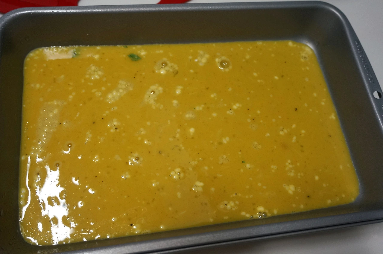 2. 오븐용기를 기름으로 코팅하고 (1)의 달걀 반죽을 넓게 펴준다.