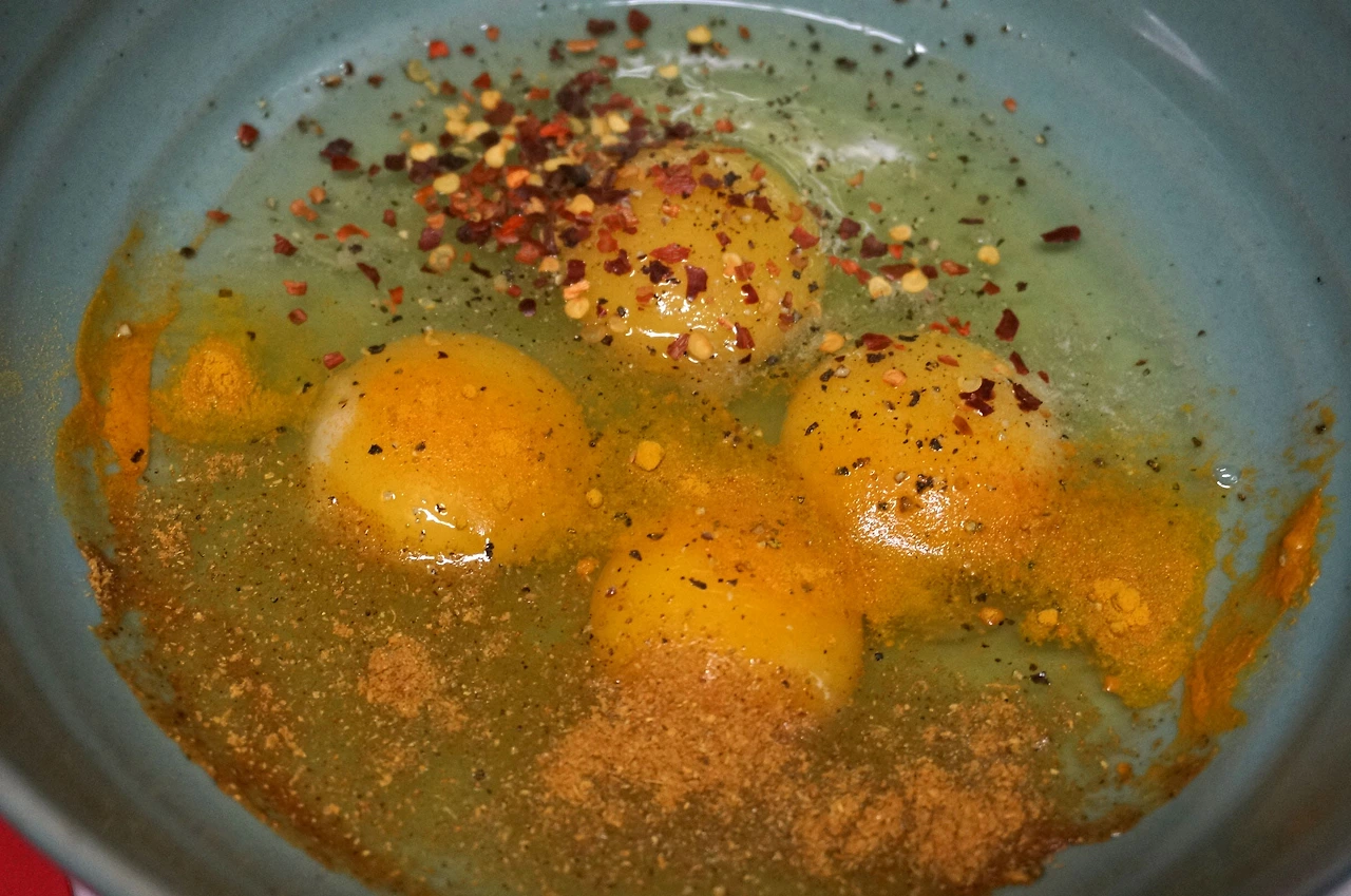 4. 달걀 4 개를 풀고 소금으로 간하고 후추, 커리파우더, 강황 등의 향신료를 듬뿍 뿌려서 섞는다.