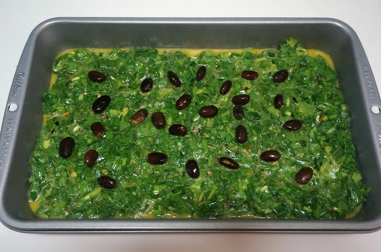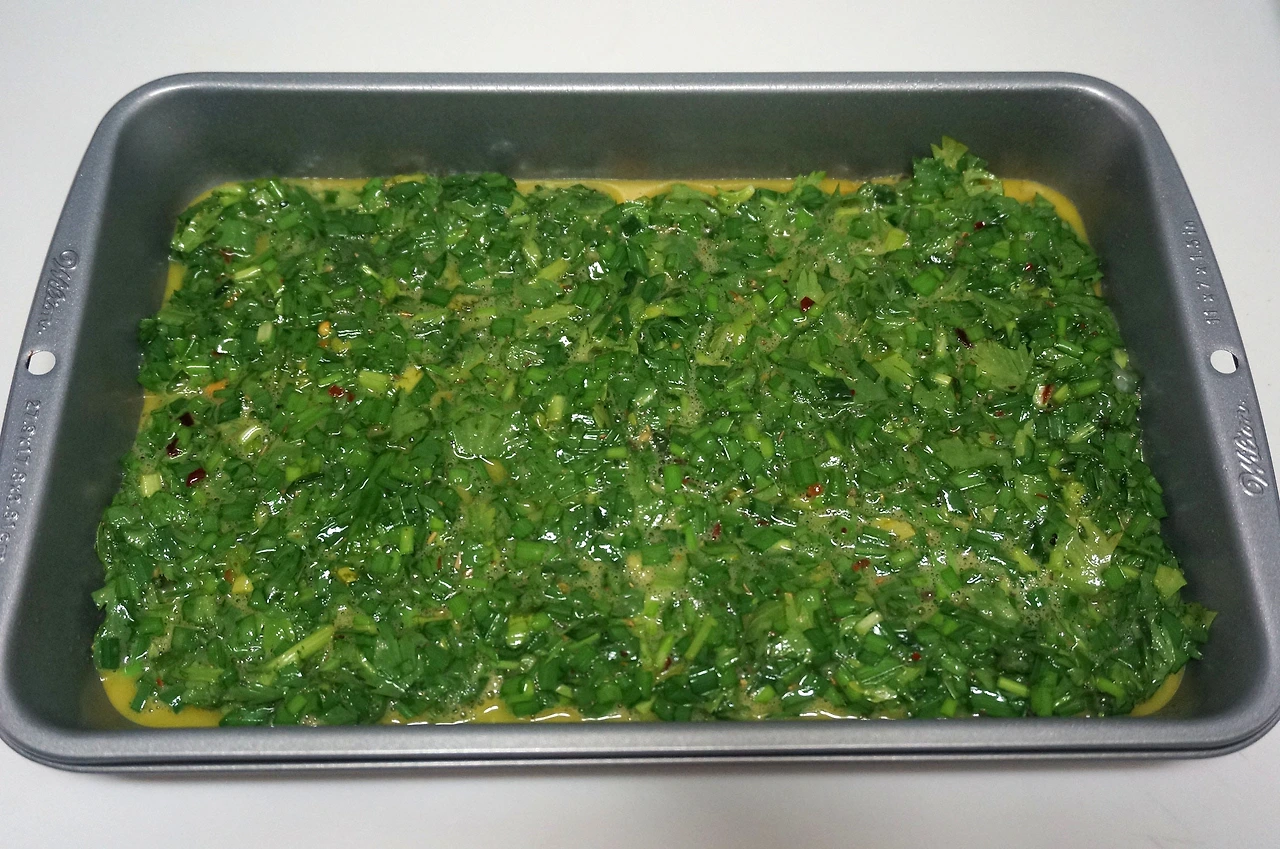 허브 달걀 반죽을 앞뒤로 굽는 기본적인 쿠쿠 삽지보다 모양이 더 예뻐 보여 선택한 아래의 레시피. 오븐이 필요하므로 오븐이 없는 사람들은 기본적인 팬 프라잉 쿠쿠 삽지를 만들면 된다.