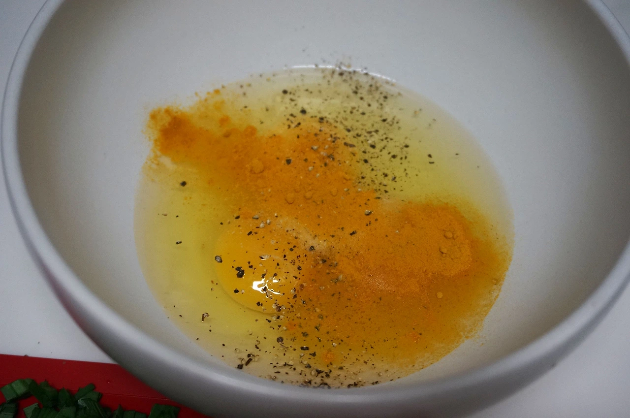 1. 달걀 3 개를 풀어 소금, 후추, 강황가루를 넣고 젓다가 밀가루 1 밥숟갈을 넣고 잘 섞는다.