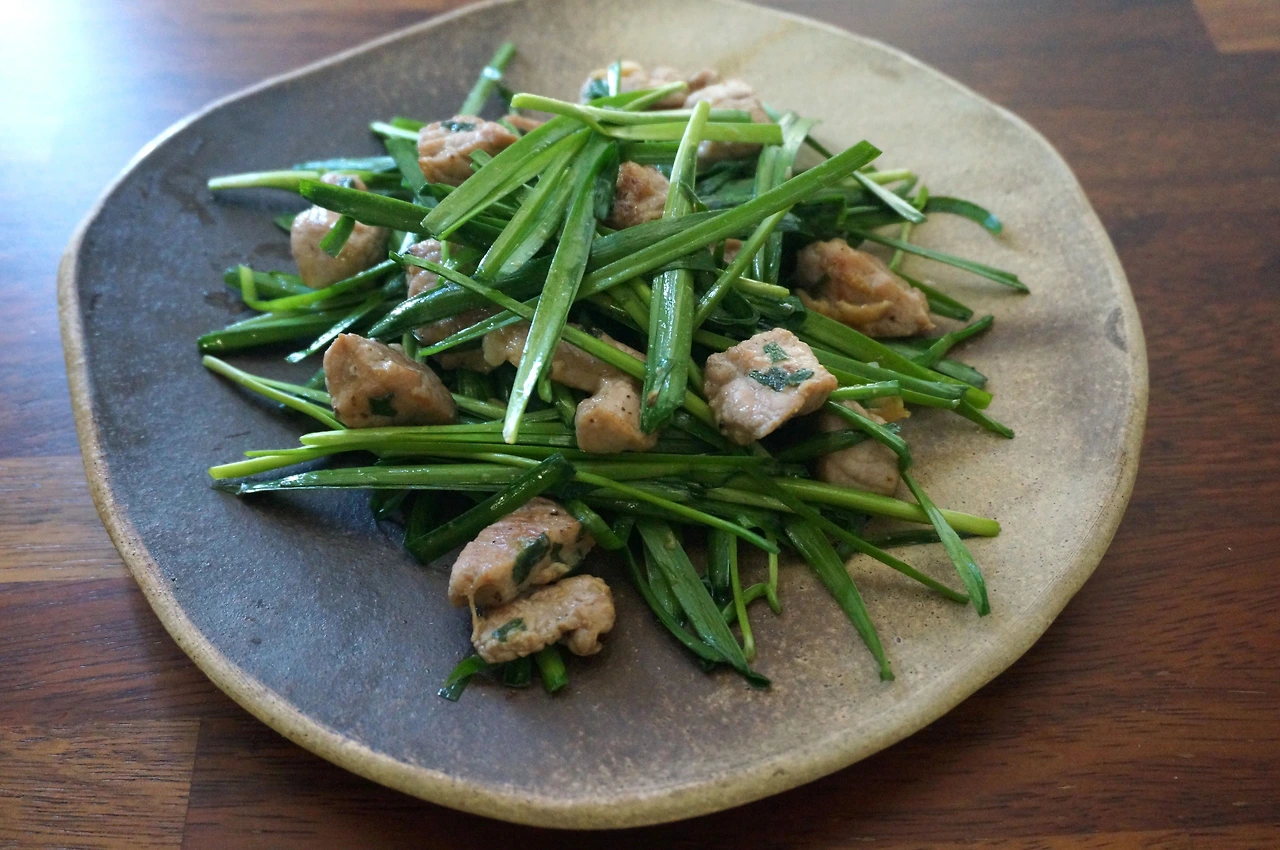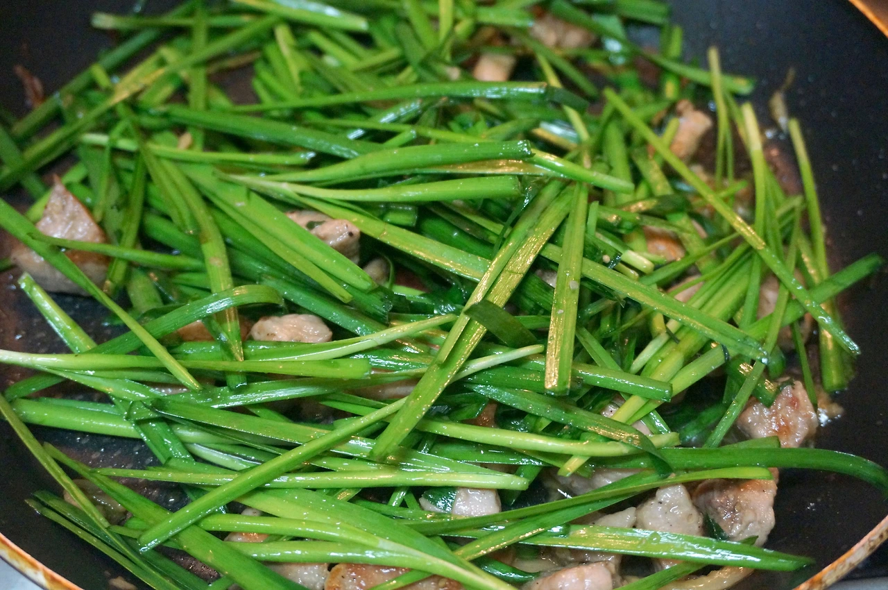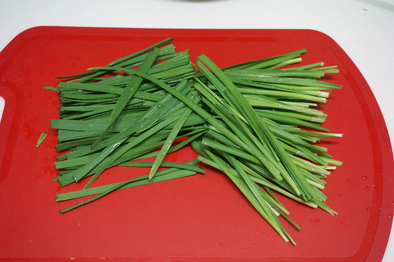 아쉽게도 한국에서는 부추 꽃대를 구하기가 매우 어렵다. 부추를 집에서 직접 기르든가, 차이나타운 등지의 소수의 중국 레스토랑에 찾아가야만 맛볼 수 있는 것 같다. 이가 없으면 잇몸이라고, 부추 꽃대가 없으니 그냥 부추를 사용하기로 한다. 식감의 차이는 부추를 아주 살짝 익혀서 최소한 흐물거리지 않게 하는 것으로 타협을 보기로 했다.
