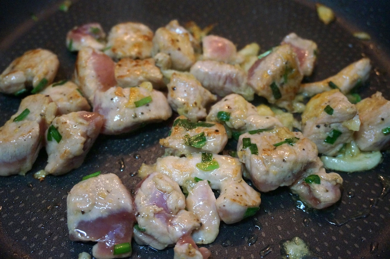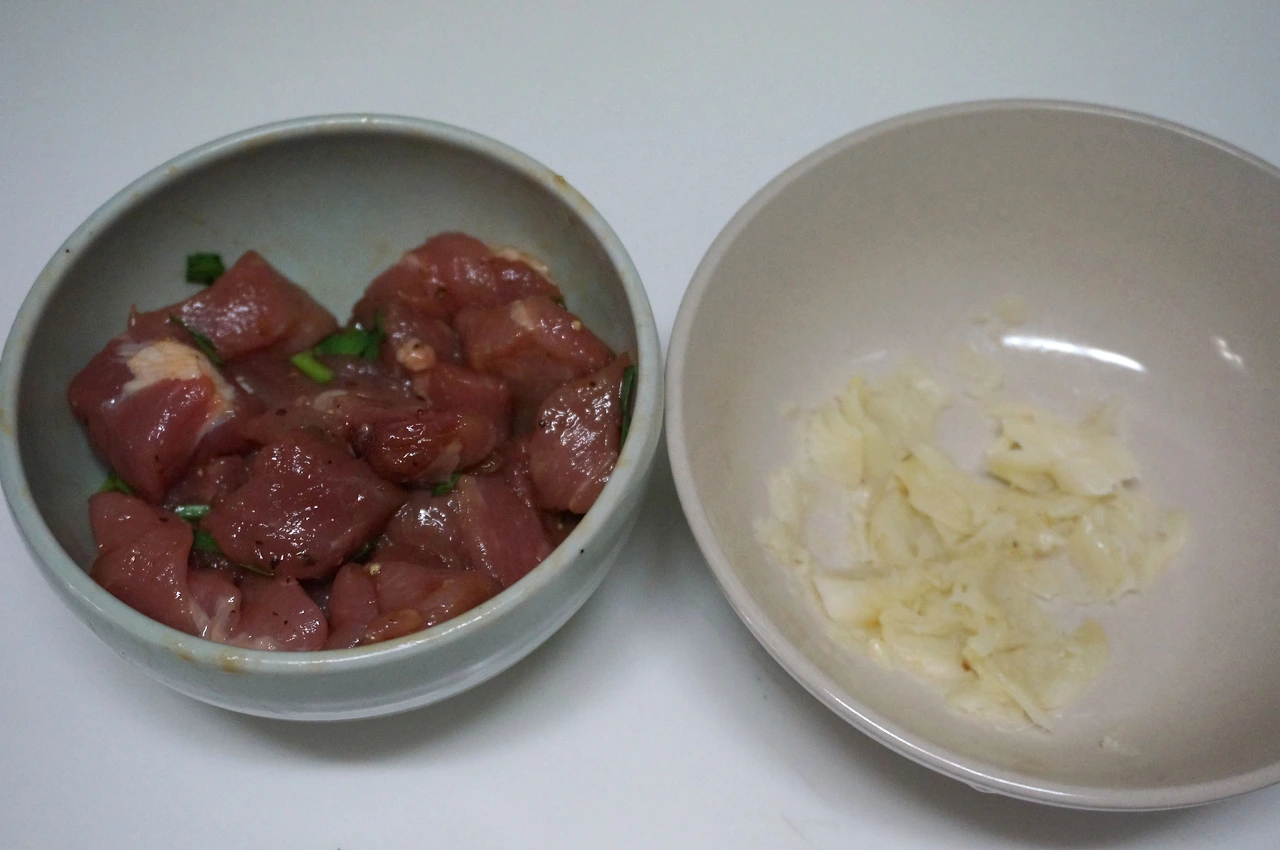 냉장고에서 이틀을 묵은 돼지고기에 살짝 잡내가 나서 소금, 후추, 올리브유, 간장 약간으로 마리네이드 했는데, 신선한 돼지고기가 있다면 필요 없는 과정이다.