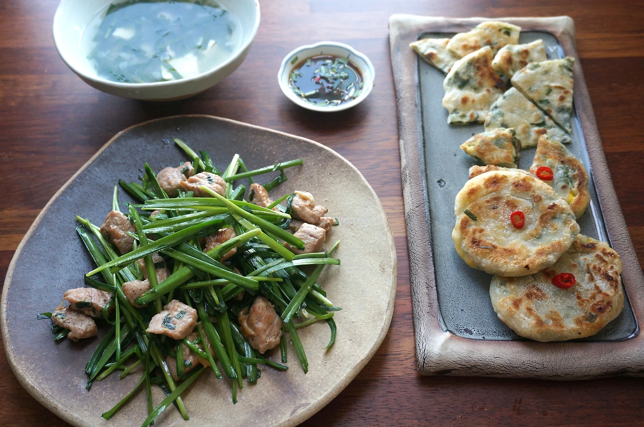일본식 부추 야채죽, 조스이를 만들고, 베트남의 부추 두부국을 끓이고, 중국의 부추 호떡을 만들기도 하고, 태국의 부추 돼지고기 볶음도 시도해보았다. 부추 두부국을 만든 바로 다음날 이 볶음 요리와 중국식 부추 호떡을 만들었기 때문에 아래 사진과 같이 세 가지 부추요리가 모두 한데 모일 수 있었다.