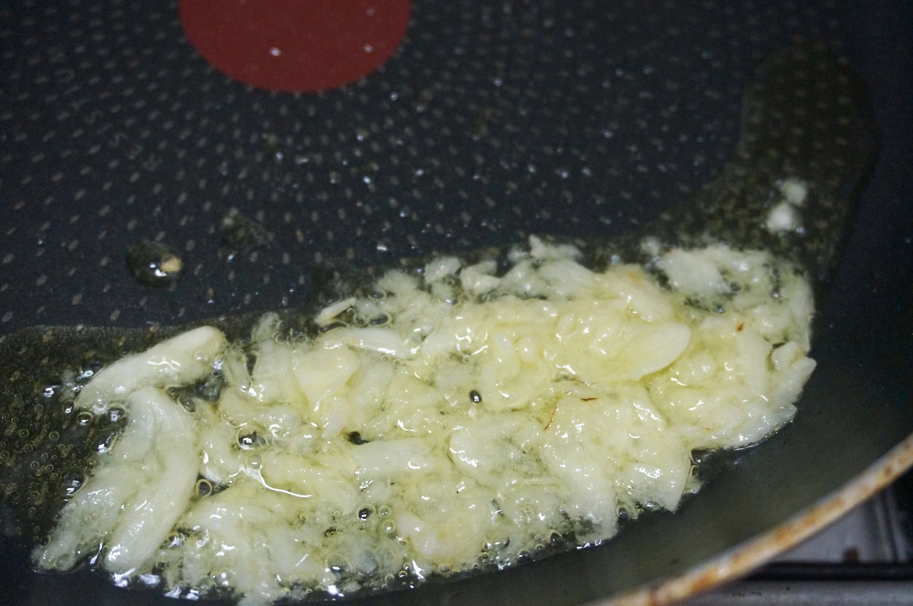 3. 팬에 식물성 기름(식용유, 카놀라유, 포도씨유) 등을 두르고 (2)의 다진 마늘을 넣어 기름에 튀기듯 익힌다. 마늘향을 기름에 입히기 위한 과정이다. 약 30초 간 마늘이 황금빛이 될 때까지 익힌다.