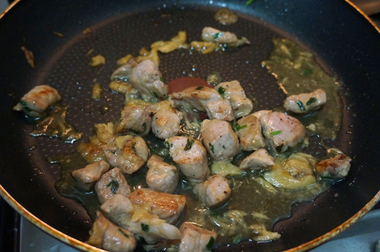 4. (3)의 마늘 기름에 돼지고기를 넣고 노릇하게 익을 때까지 볶는다.