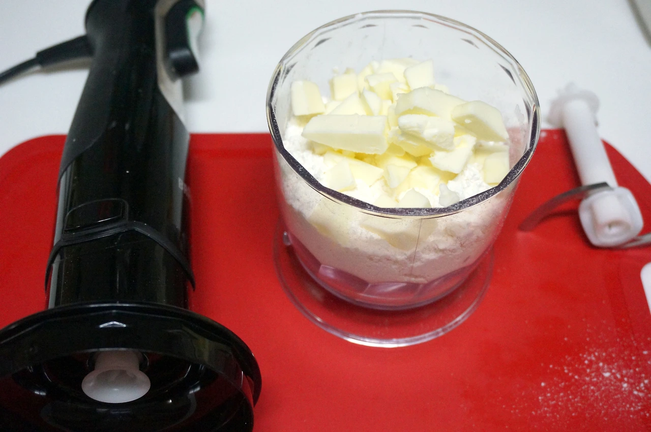 2. 푸드 프로세서나 믹서에 밀가루, 소금, 차가운 버터 큐브를 놓고 갈아서 잘 섞는다. 버터가 작은 알맹이로 갈아져서 질감이 축축한 모래 같은 질감이 되면, 달걀 1 알을 넣고 다시 믹서를 돌려 반죽한다. 반죽의 점도를 보고 필요하면 차가운 물을 더 섞는다.