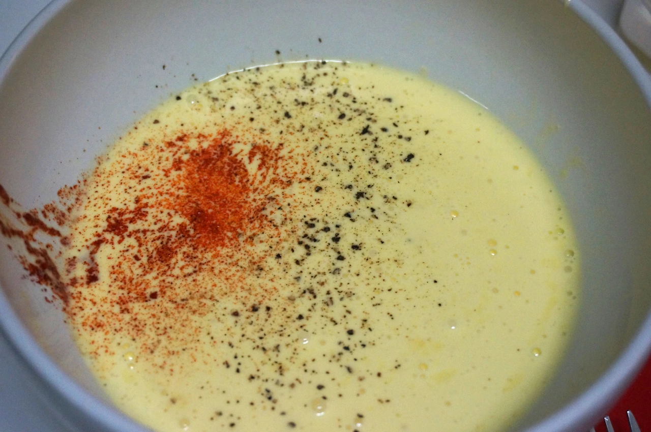 6. 달걀, 크림, 소금, 후추, 카옌페퍼, 넛맥을 거품기로 섞어 커스터드 필링을 만든다.