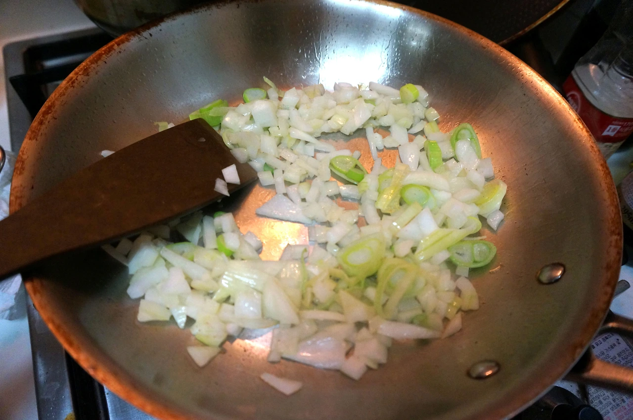 5. 키쉬 필링을 준비한다. 버터를 넉넉히 두른 팬에서 양파가 황금색이 돌 때까지 볶는다.