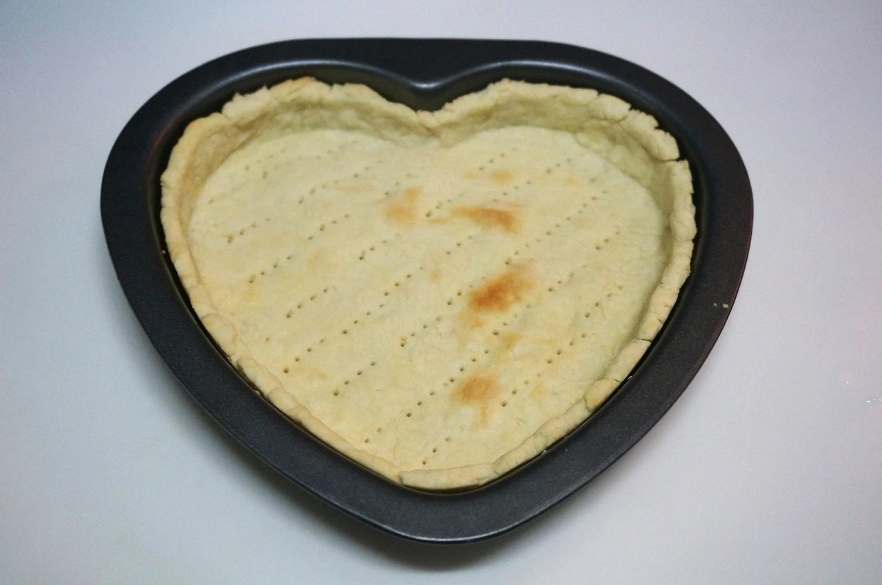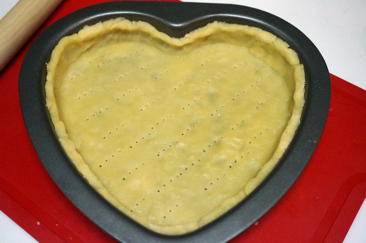 4. 밀대로 파이 반죽을 넓게 편 후에, 다시 밀대에 반죽을 살짝 감아 그것을 파이팬 위에 굴려 펼치면서 반죽의 자리를 잡는다. 공기가 들어가지 않도록 구석구석 손가락으로 꼭꼭 눌러준 후, 포크로 바닥에 구멍을 찍어준다. 파이 모양이 잡히면 비닐봉지로 싸서 냉동실에 살짝 넣어준다.