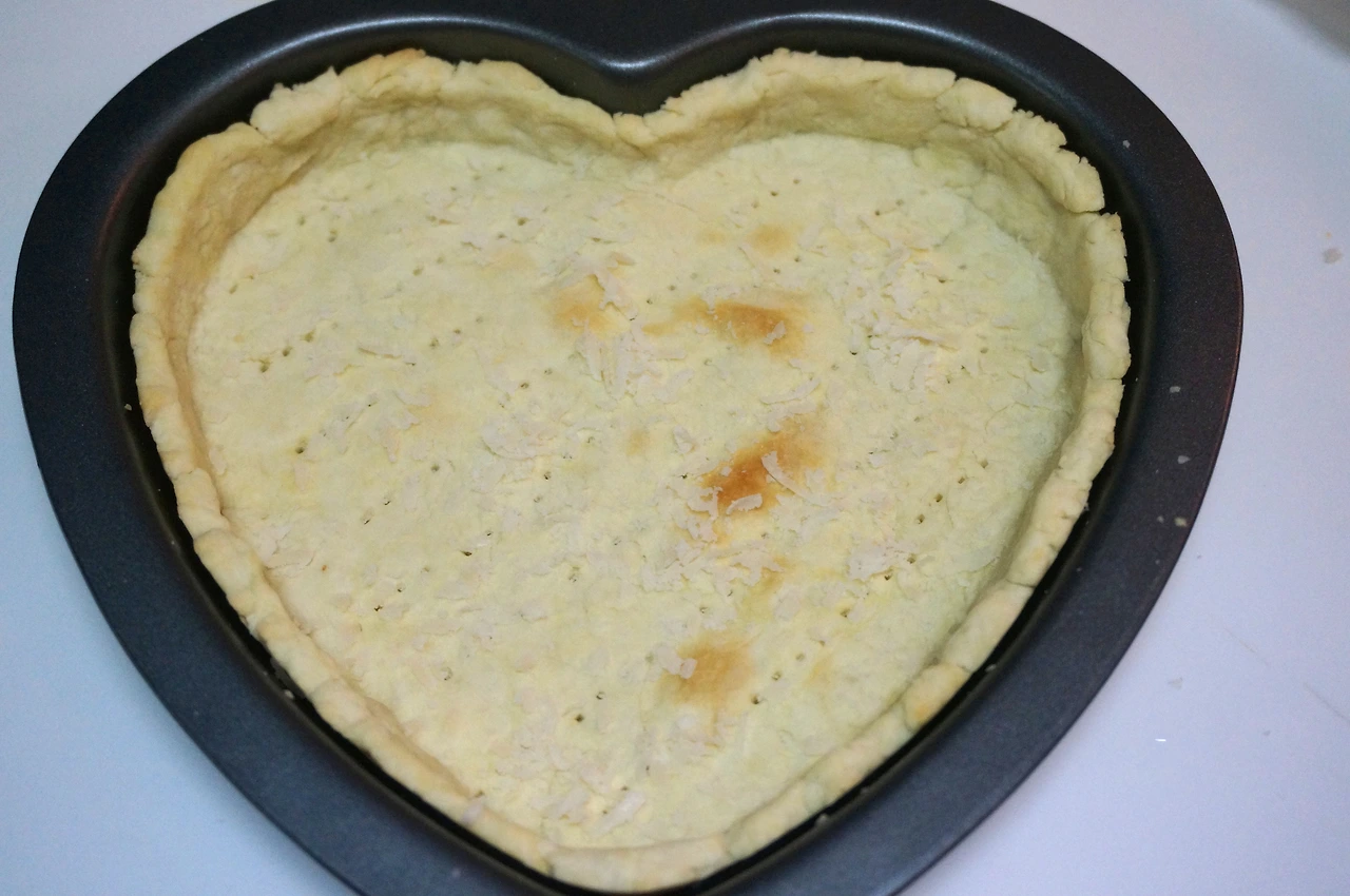 8. 오븐에서 빼낸 파이 반죽은 조금 수축해 있는 것이 정상. 그 위에 치즈를 갈아 올리고
