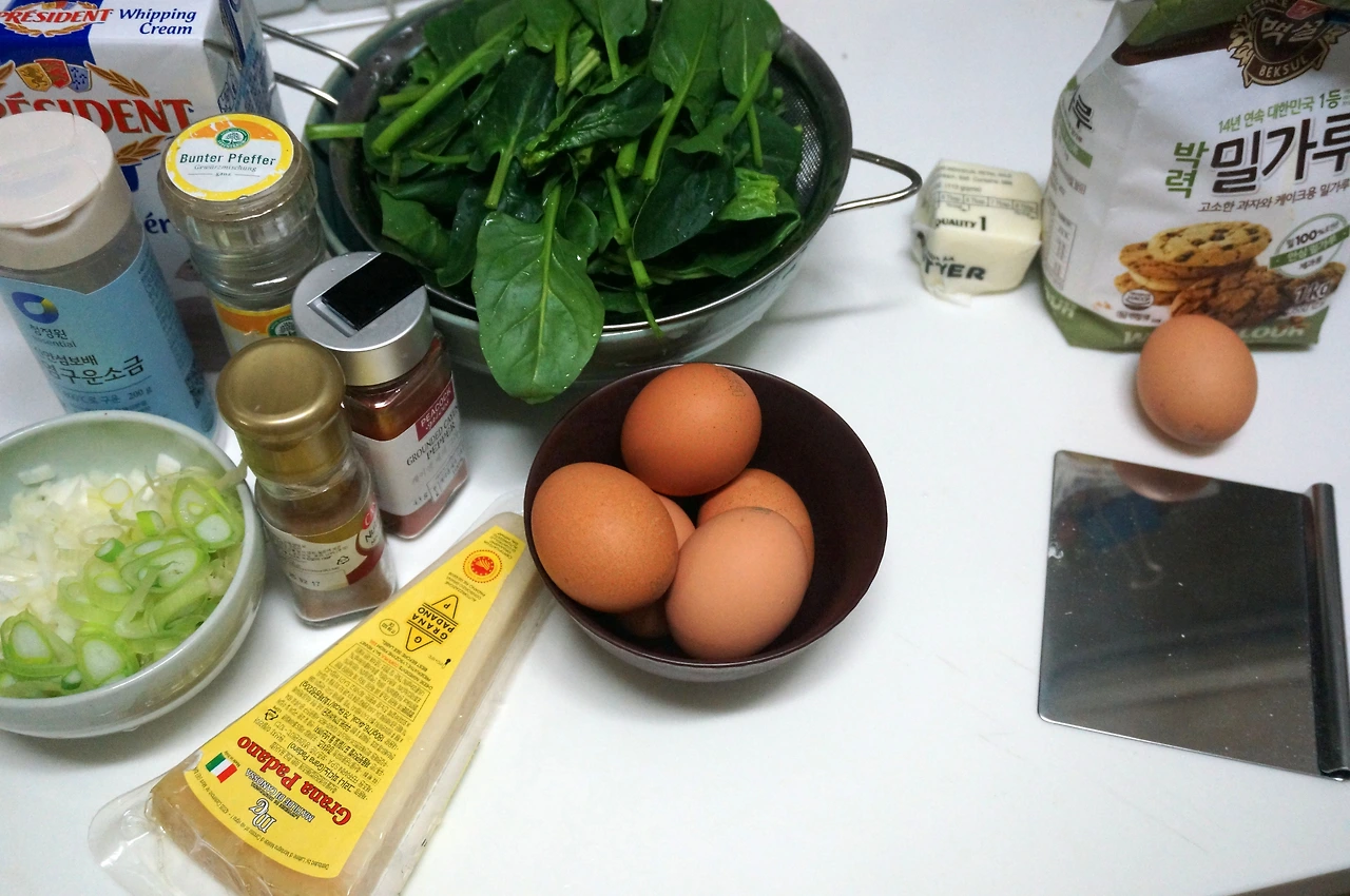 그러던 중, 오븐을 사용하는데 익숙해지자 머릿속에 스르륵 떠오른 생각 하나. 키쉬를 구워봐야겠다. 기억이란 은근히 생존력이 강한 것이 잊은 듯해도 잊게 되는 것이 아니어서, 그 생각이 든 이후로는 좀이 쑤셔 견딜 수가 없었다. 코스트코에서 큰 맘먹고 대용량 크림도 사고 치즈도 샀다. 시금치 한 단이 천원인 걸 발견하자, 재료도 다 모였겠다 지체 없이 작업에 착수할 수 있었다.