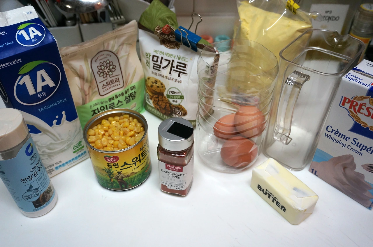 -옥수수 0.5 kg 정도 (Chef John은 냉동 옥수수를 썼는데, 나는 통조림 옥수수 한 캔을 사용했다. 통조림을 사용한다면 소금은 넣지 않아도 되는데, 이미 통조림 옥수수에 간이 충분히 되어있기 때문이다)