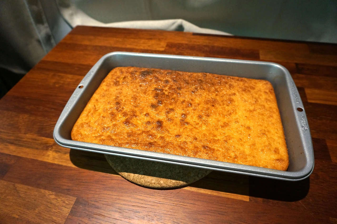 2) (1)의 반죽을 녹인 버터로 코팅한 트레이에 담고 180도의 오븐에 1시간 정도 굽는다.