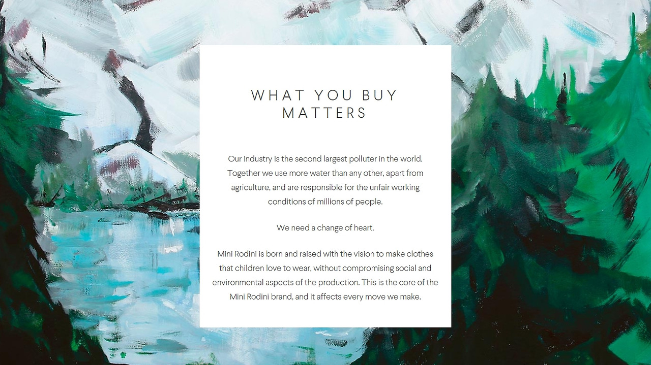 얼마 전 미니로디니의 뉴스레터를 받았는데 제목은 “What you buys matters”로 참 미니로디니스러운 타이틀이다 싶었다. 뉴스레터에는 오가닉 코튼의 중요성, 환경을 지키기 위한 노력, GOT의 인증을 받은 이야기 등으로 이들의 차별화된 스토리와 진정성을 보여주고 있었다. 그래서인지 미니로디니의 뉴스레터는 늘 기다리게 된다. 예쁜 옷뿐만 아니라 이들의 재미있는 캠페인, 리미티드 에디션, 환경에 대한 새로운 소식 등으로 가득한 뉴스레터를 보면 반가운 마음까지 든다.