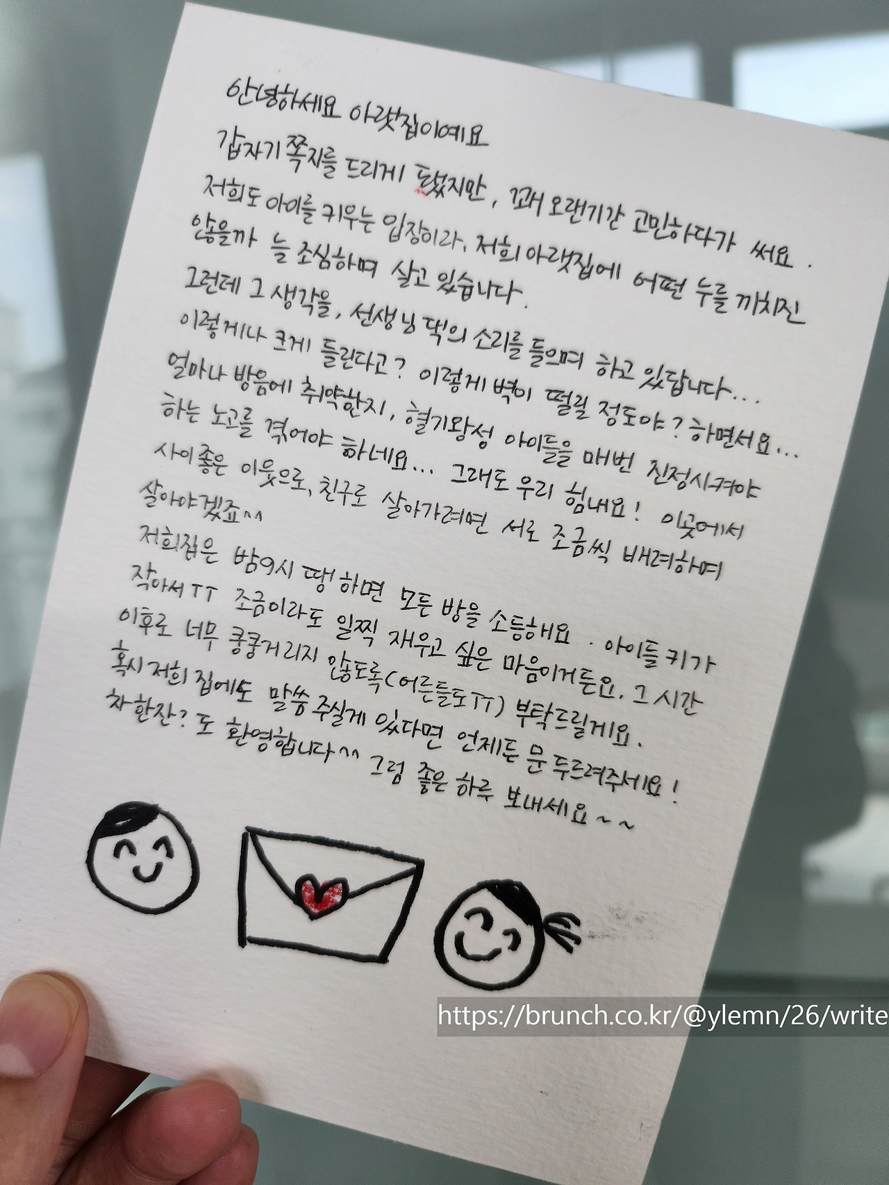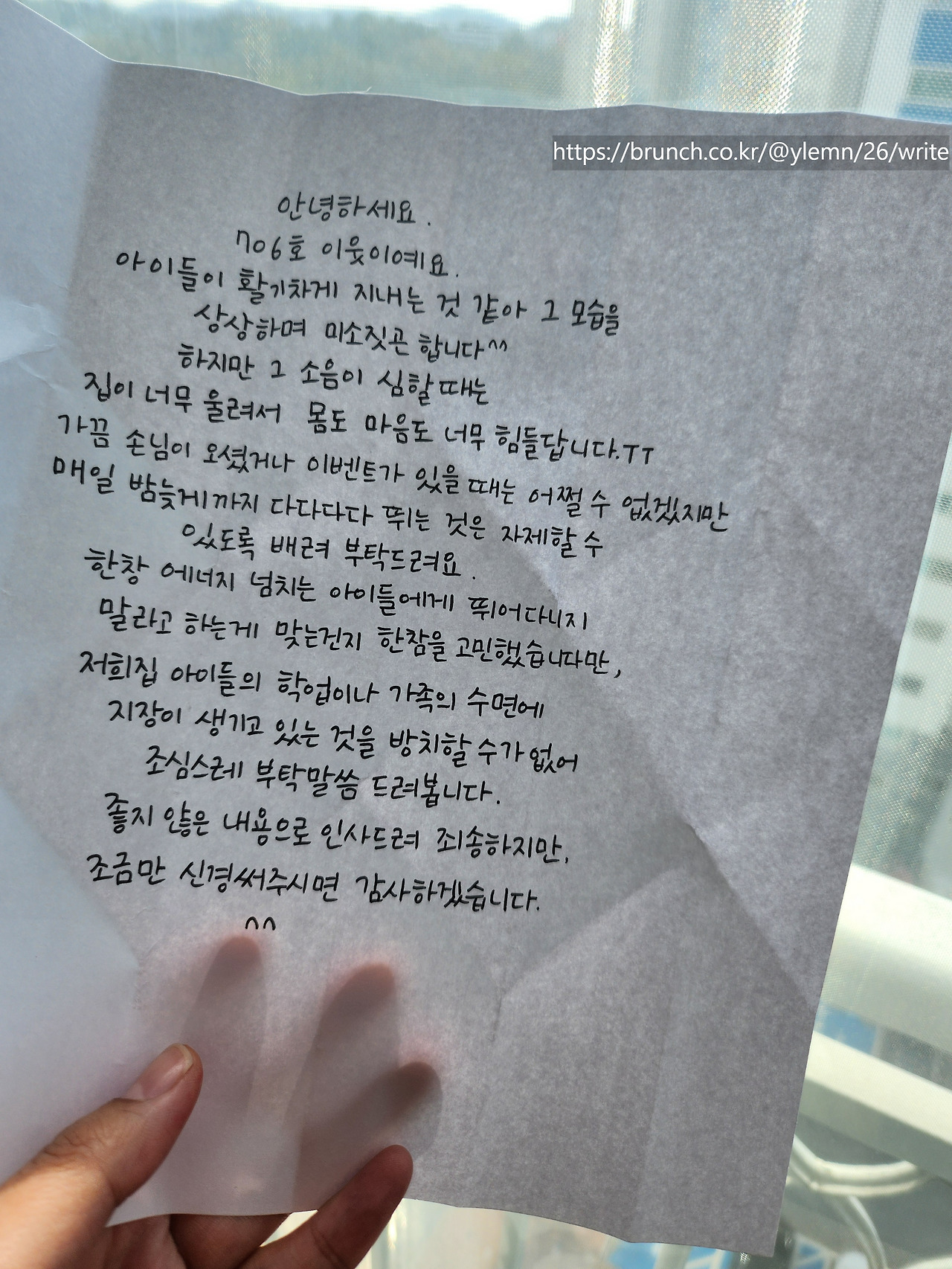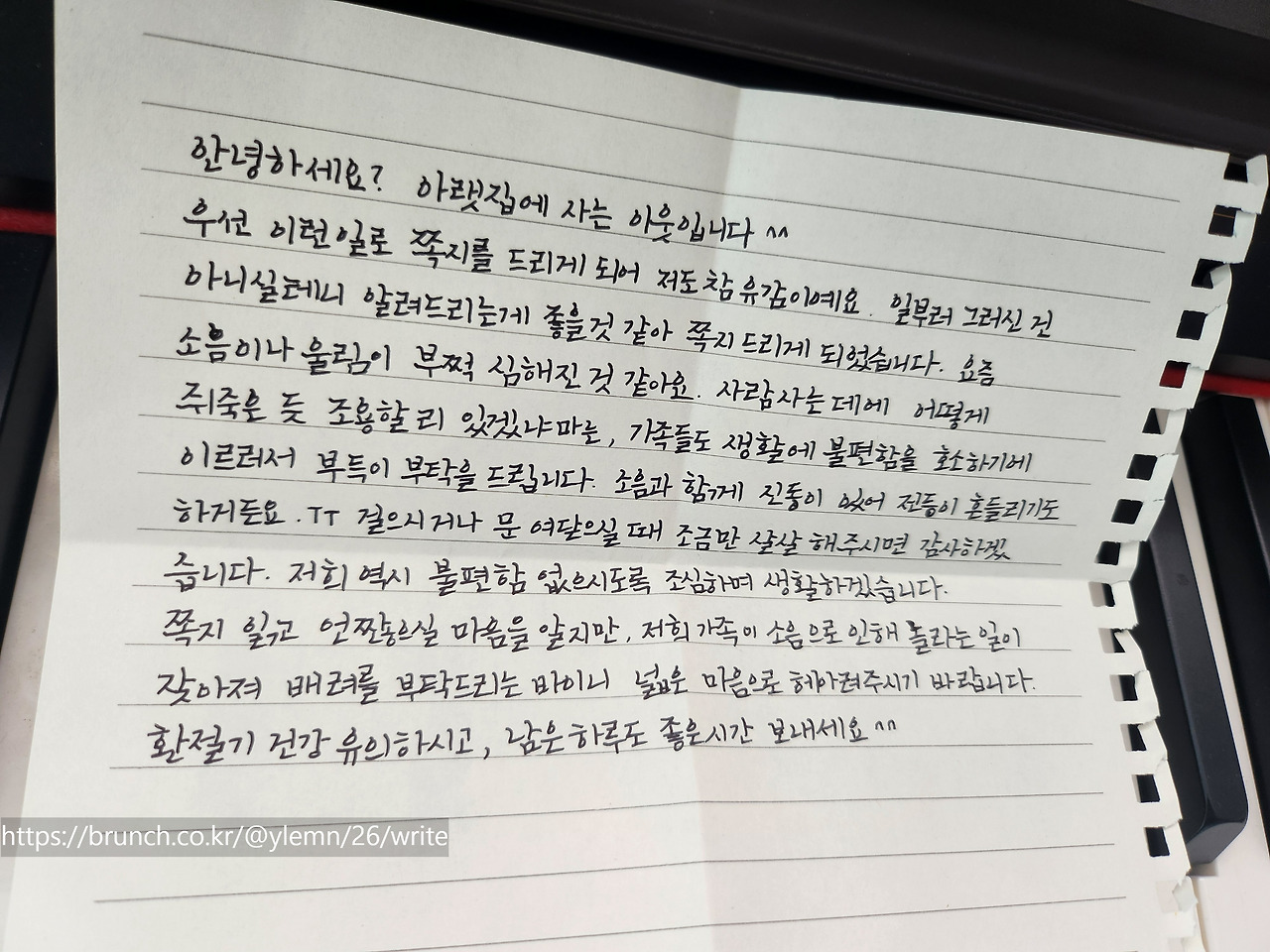 성숙한 대응으로 불편함을 해결하고 나아가 이웃 간의 좋은 관계를 맺을 수 있도록 소통의 기술을 펼치시길 바라겠습니다. 성급한 행동보다는 우아한 쪽지 한 장으로 여러분의 품위도 한껏 올려보시길!