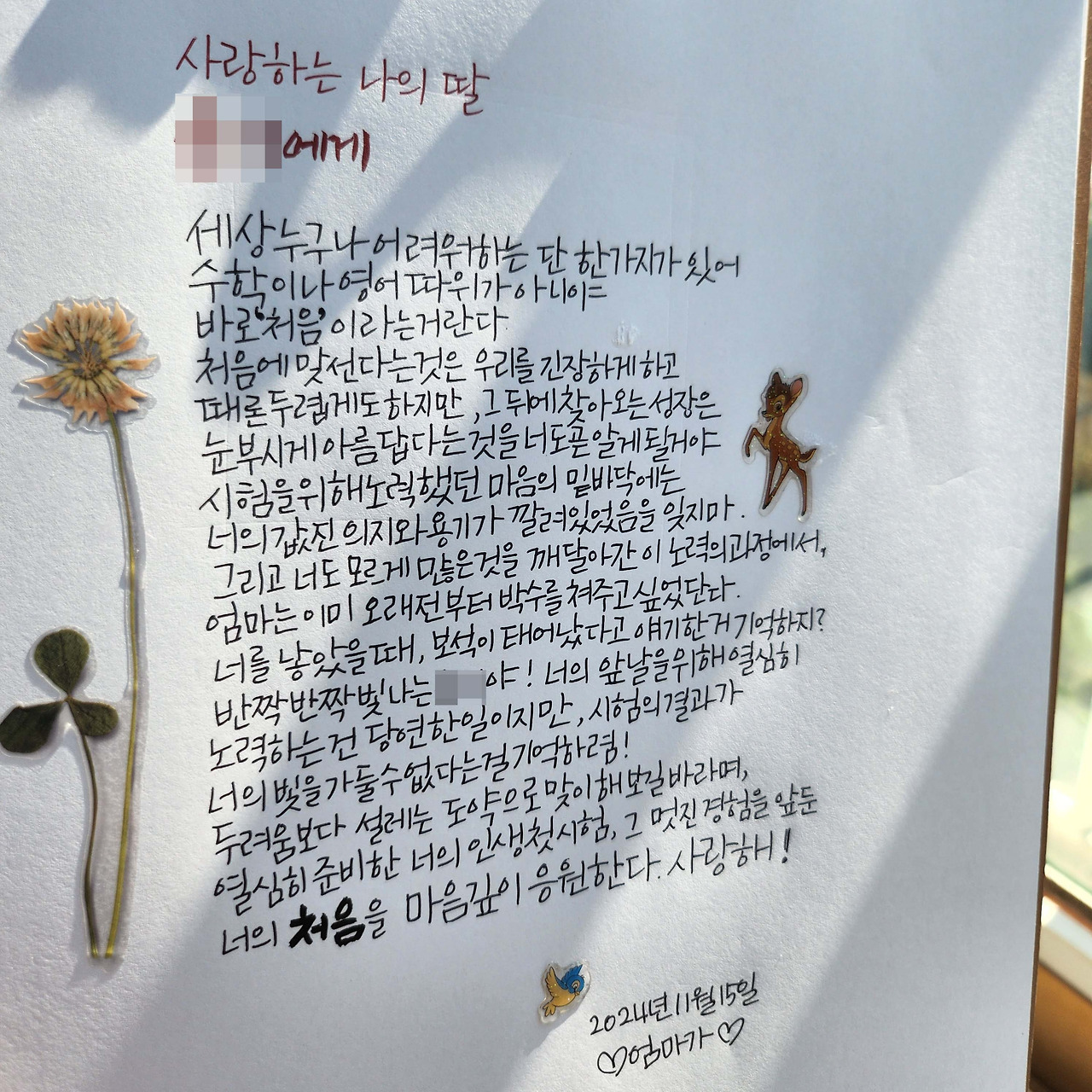 이런 와중에 며칠 전, 담임 선생님께서 학부모들에게 비밀문자를 뿌렸는데요, 첫 시험을 앞둔 아이에게 응원의 편지를 써서 몰래 전달부탁드린다는 내용이었어요. 아우 센스있으셔라