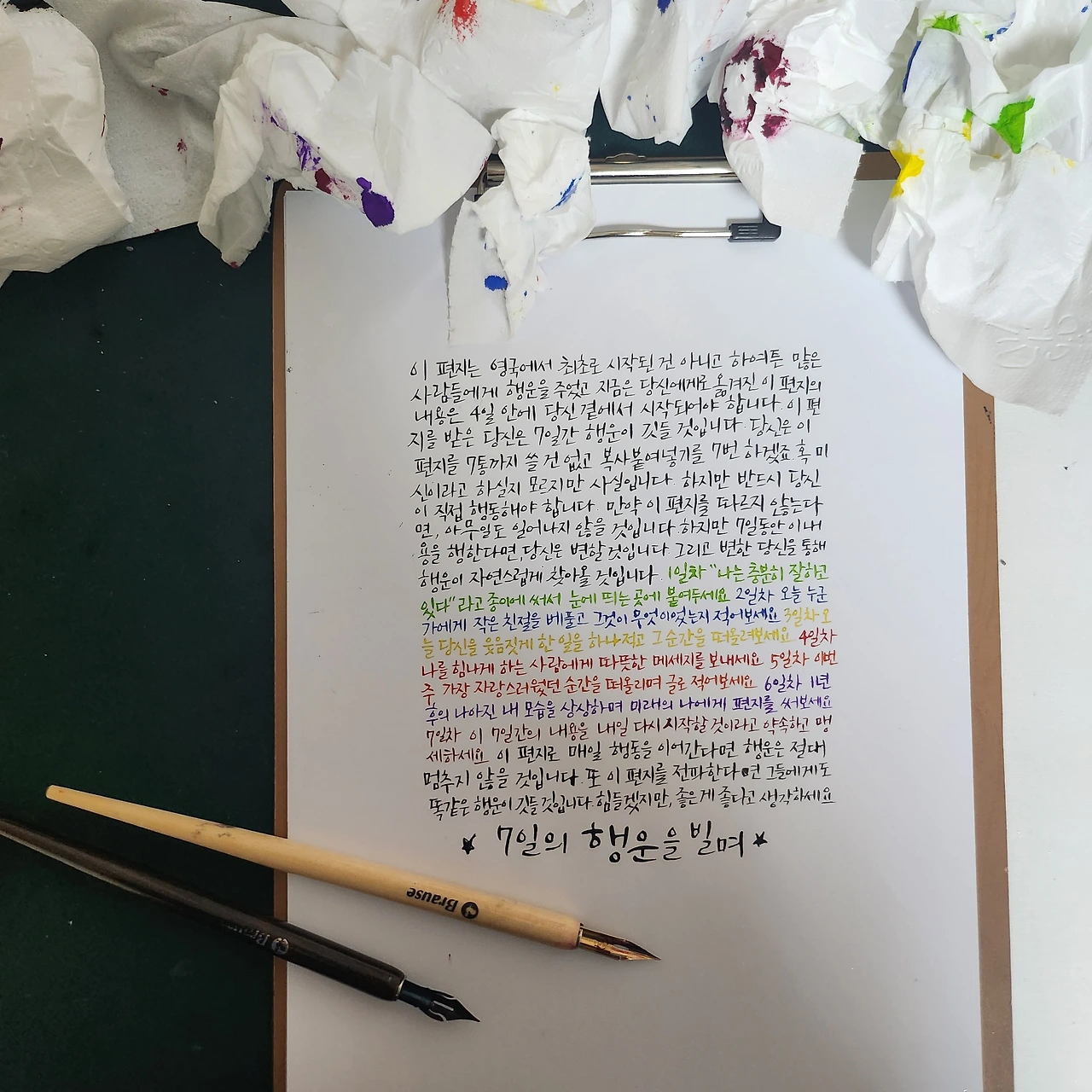 행운의 편지 Ver.2.0은 바로 이런 점에서 새로운 의미가 되었으면 좋겠어요. 단순한 미신이 아니라 작은 습관을 통해 긍정적인 변화를 일으키는 하나의 과정이 되는 것이죠. 매일 한 가지씩 실천하며 스스로를 돌아보고, 좋은 에너지를 전파하는 것. 그렇게 하면 결국 행운이란 단순한 기대가 아니라 실체가 되어 우리 삶에 자리 잡을 거예요.