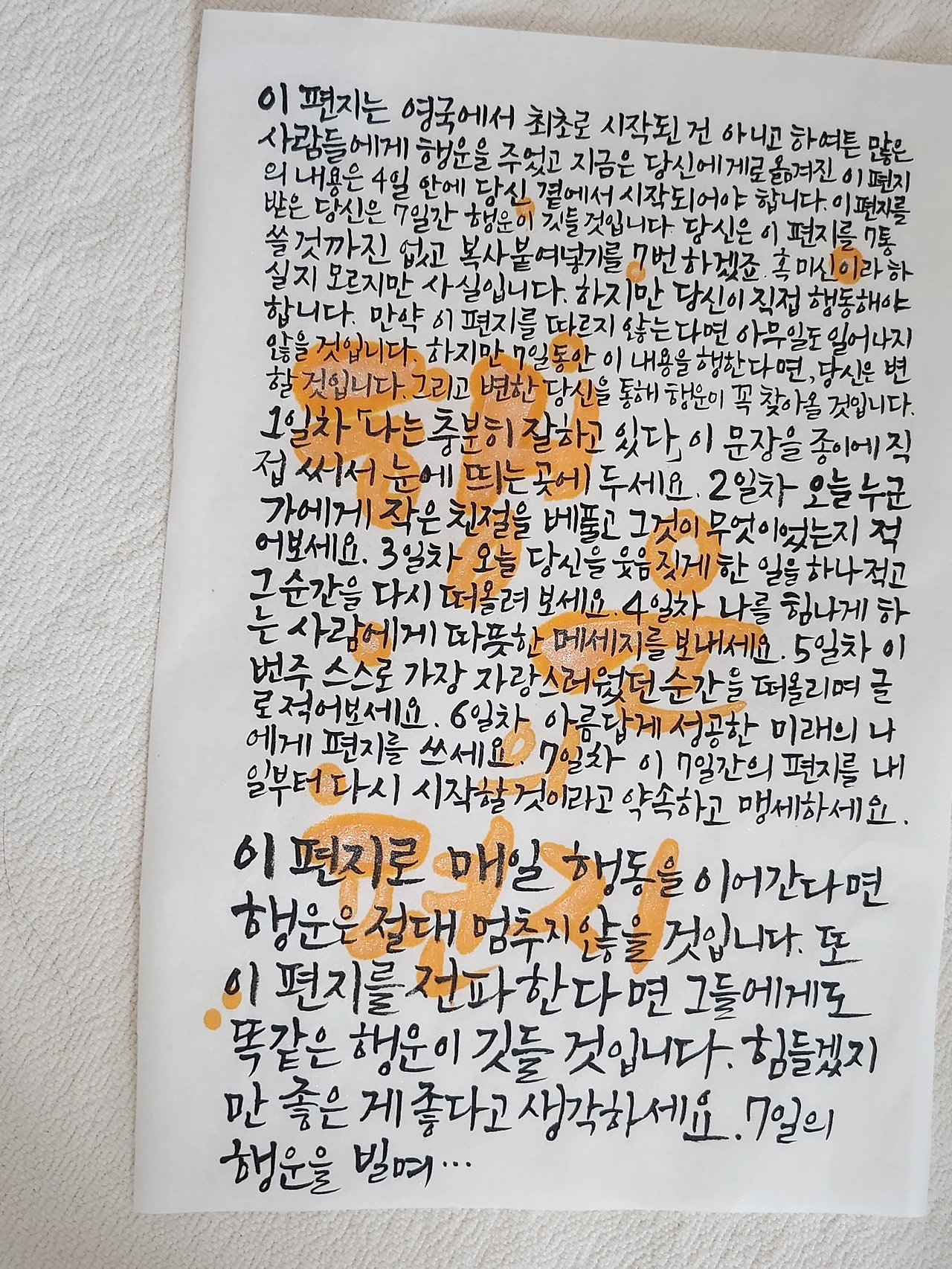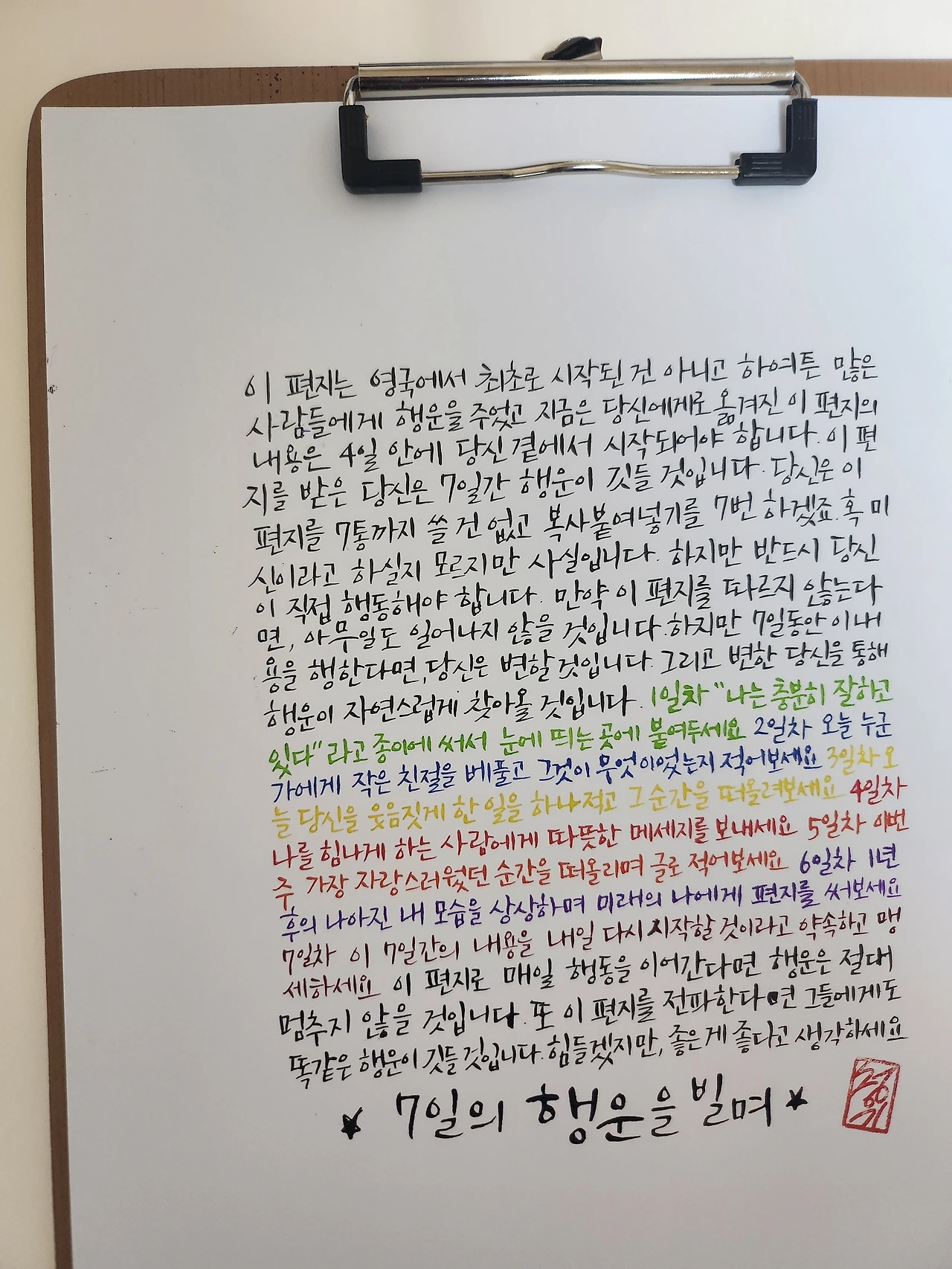 이 편지로 매일 행동을 이어간다면 행운은 절대 멈추지 않을 것입니다. 또 이 편지를 전파한다면 그들에게도 똑같은 행운이 깃들 것입니다. 힘들겠지만, 좋은 게 좋다고 생각하세요. 7일의 행운을 빌며…