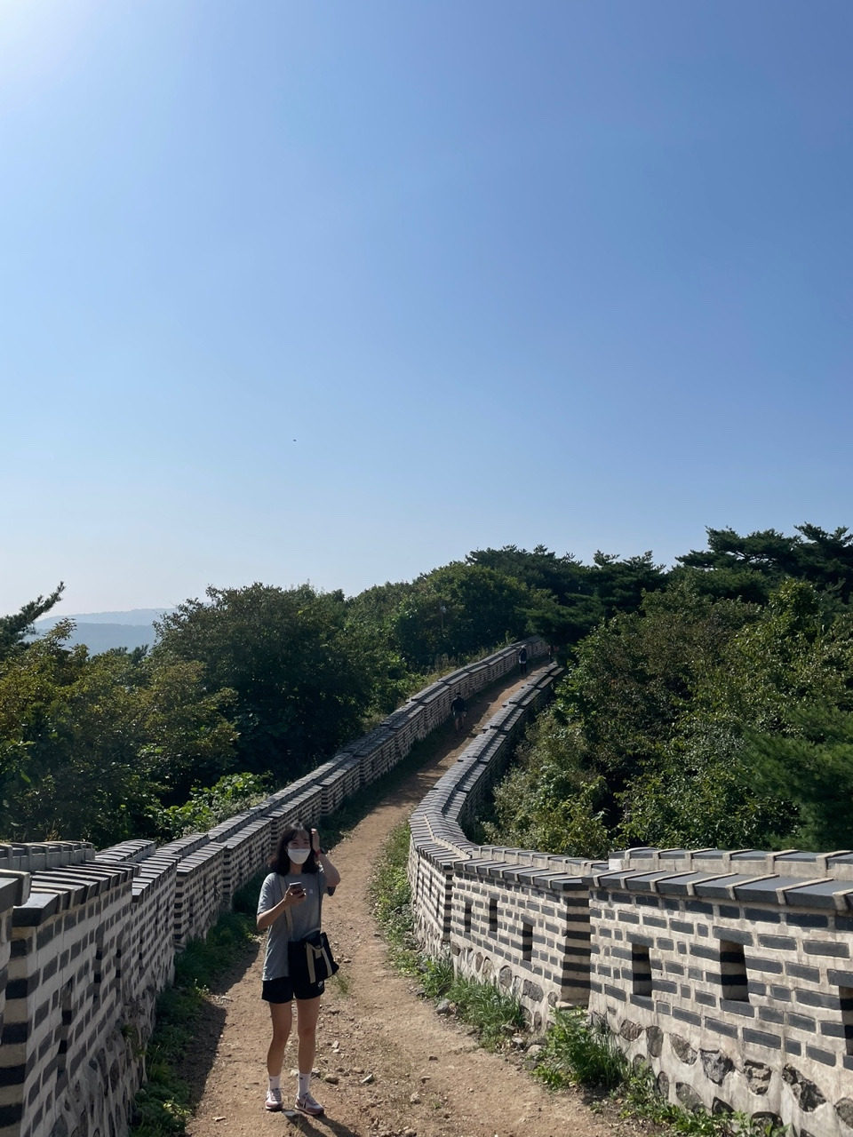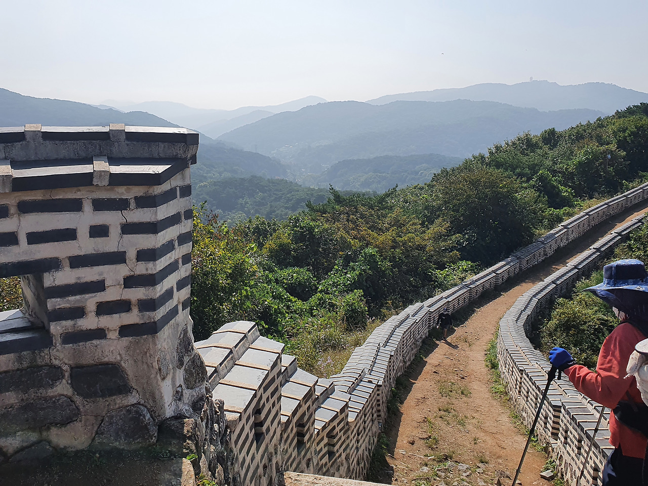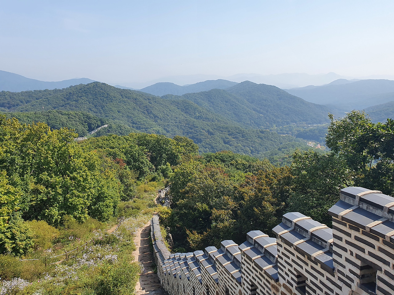 남문로터리에서 출발했더니 생각보다 경사로가 없는 편이었다. 적당한 순간에 산성 벽을 따라다니니 등산객이 많이 없는 신기한 길들을 걸을 수 있었다. 남한산성은 등산객에게 굉장히 친절한 곳이며, 저강도 운동으로 가볍게 땀 흘리며 걷기 좋은 느낌이라 강아지를 데려온 분이나 노부부가 많았다. 게다가 앉아서 쉴 수 있는 의자와 테이블이 많아서 평화롭게 산을 즐기기 좋은 완벽한 공간이었다. 아직 만리장성을 못 가봤지만 남한산성을 내려다보며 여기가 한국의 만리장성이라고 생각했다.