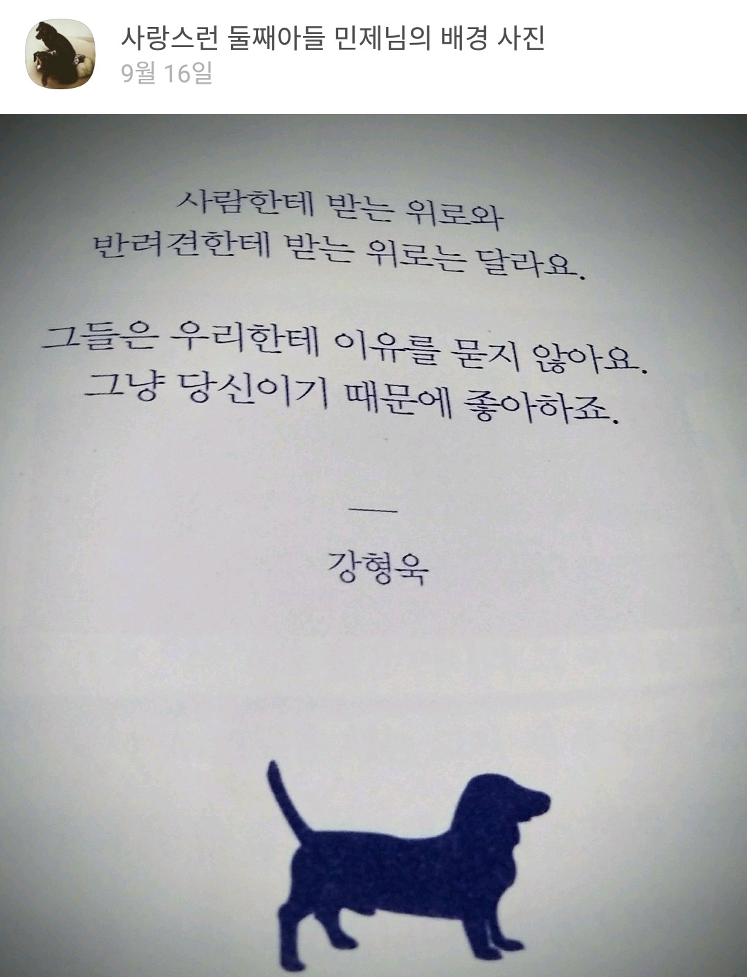 사실 개를 키워본 사람이라면 모두 공감하지 않을 수 없는 게 정말 있는 그대로 나를 세상의 전부로 믿어주고 따라주는 반려견으로부터 받는 위로는 사람에게 받는 것과 전혀 다르다.