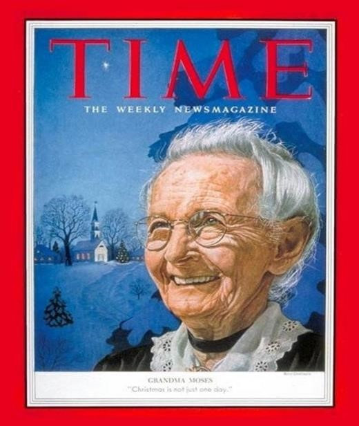 Anna Mary Robertson Moses 할머니 참 대단한 분이시다. 한 번도 배운 적 없는 그림을 시작한 나이가 76세, 88세에 올해의 젊은 여성으로 선정되었고 93세에 타임지 표지모델을 하셨다니.. 101세에 돌아가실 때까지 1600여 점의 작품을 남기셨다. 그러니 인생에서 너무 늦은 때란 없다고 할밖에.. 할머니 다큐멘터리가 제작이 되기도 하였다는데 장수 비결을 묻자 “나잇값을 안 하면 된다” “ 요즘 100살까지 안 살면 명함도 못 내미니 꼭 100살까지 살 거다”라고 하셨단다. 역시 유쾌한 할머니의 장수 비결 너무 마음에 와 닿는다. 나잇값을 안 하고 내가 하고자 하는 일을 언제든 시작할 수 있는 자신감, ‘ 늙어서 안돼, 이 나이에 무슨..’ 하는 생각을 버리고 배우고 노력하는 자세야 말로 책을 보며배우고 싶은 할머니의 자세다.