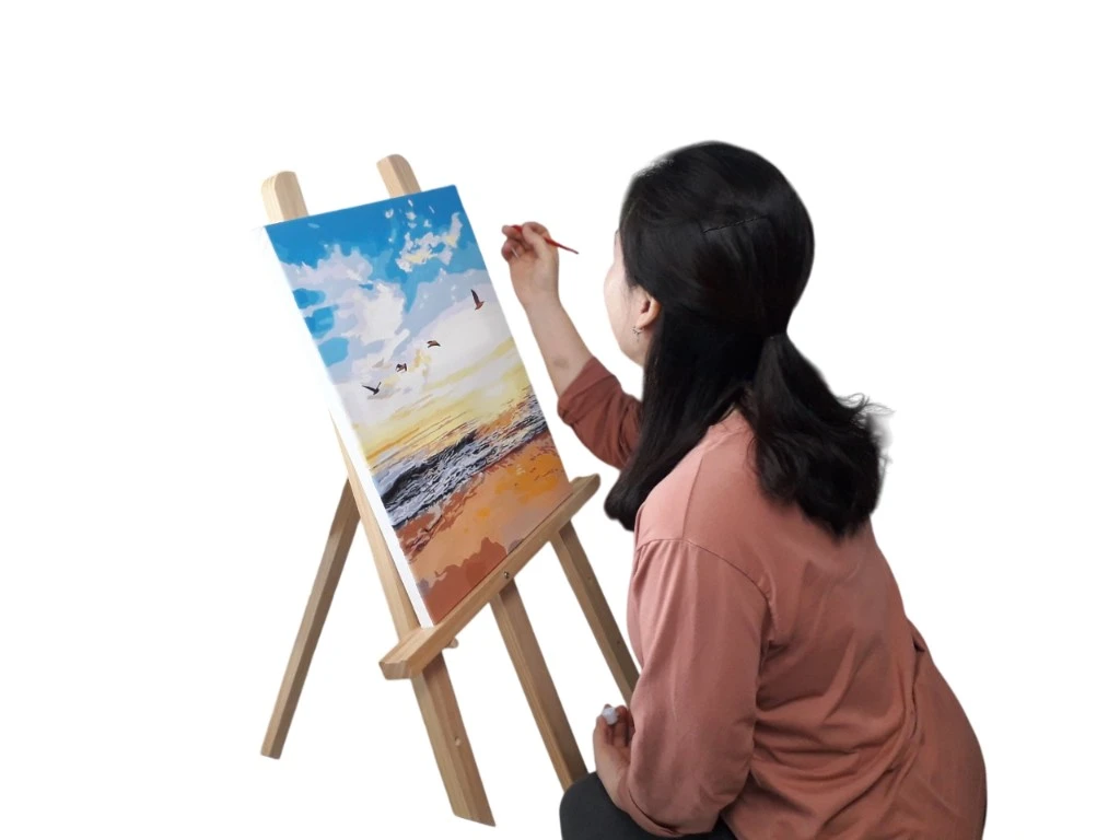 썰물로 드러난 갯벌 끝자락에는 잔잔한 파도가 걸쳐있다. 저멀리 수평선에는 눈부신 해가 솟아 오르는 타이밍이다. 캔버스 구성의 하일라이트는 두 공간 사이를 나는 갈매기 4마리다. 아내는 갈매기를 4인 가족으로 의인화 한다.