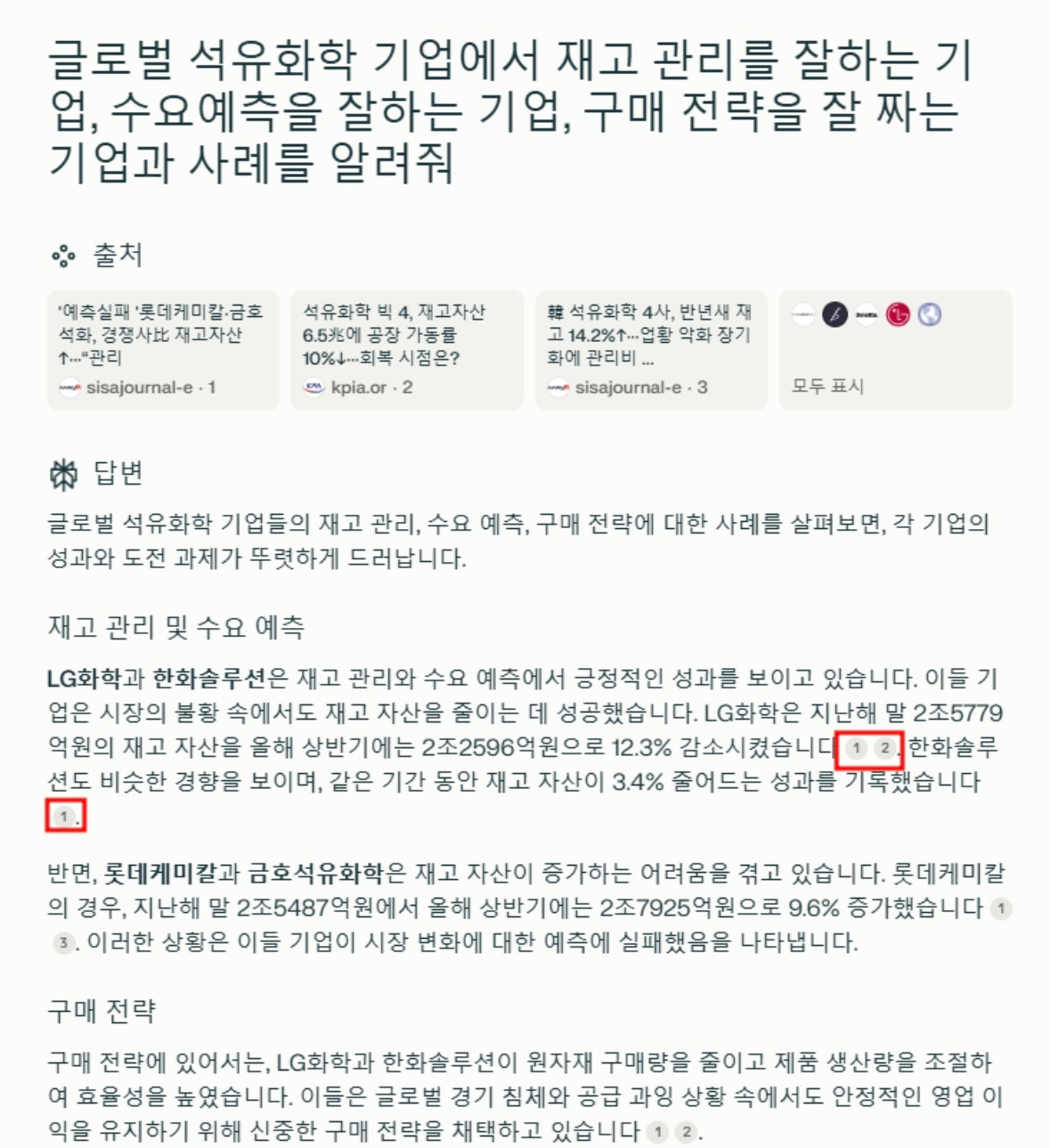찾고자 하는 정보를 입력하면, 기사, 논문, 산업보고서 등 여러 자료들을 검색해서 출처와 함께 답변해 준다.