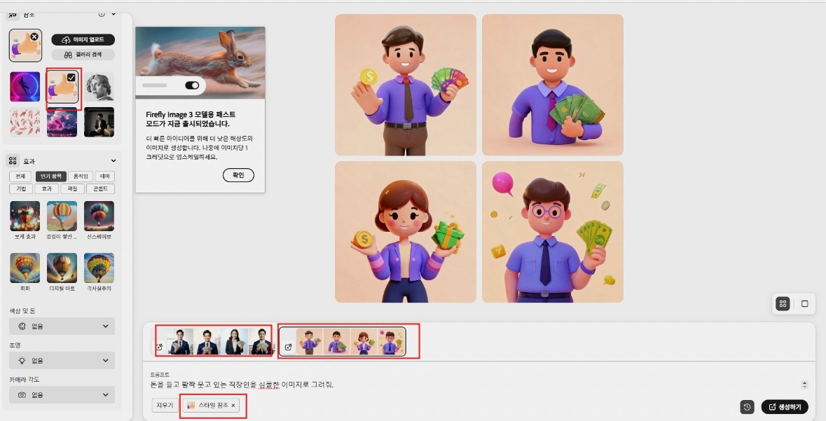 심플하고 귀여운 UI가 가장 큰 자랑이었던 이전 직장에서, 2년 전쯤 전 계열사 팀원들에게 브랜드화된 이미지, 아이콘을 생성할 수 있는 툴을 제공해 주었었다. 생성형 AI에 익숙하지 않았던 당시, 정말 미래에 살고 있다는 느낌을 받을 정도로 완성도가 상당히 좋은 툴이었는데, 이 firefly가 거의 유사한 기능을 제공해주고 있다.