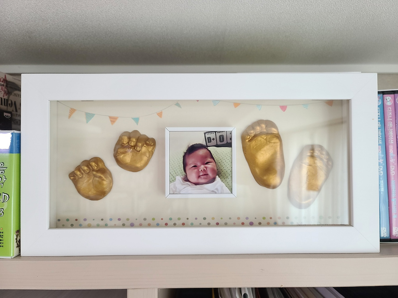 가운데 작은 미니 액자를 만들어 붙이고 양옆으로 손발 모형을 붙였다. 그러니 완성!