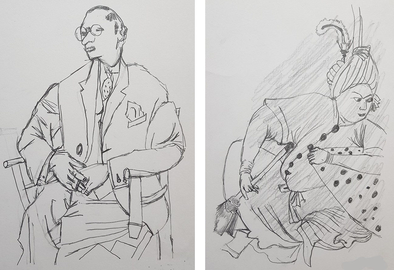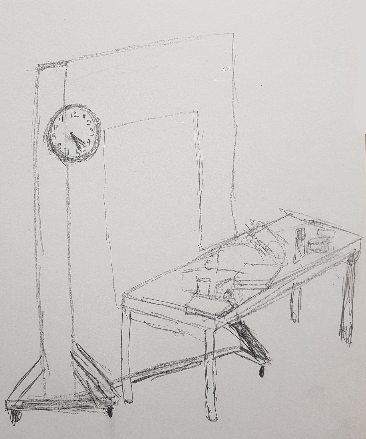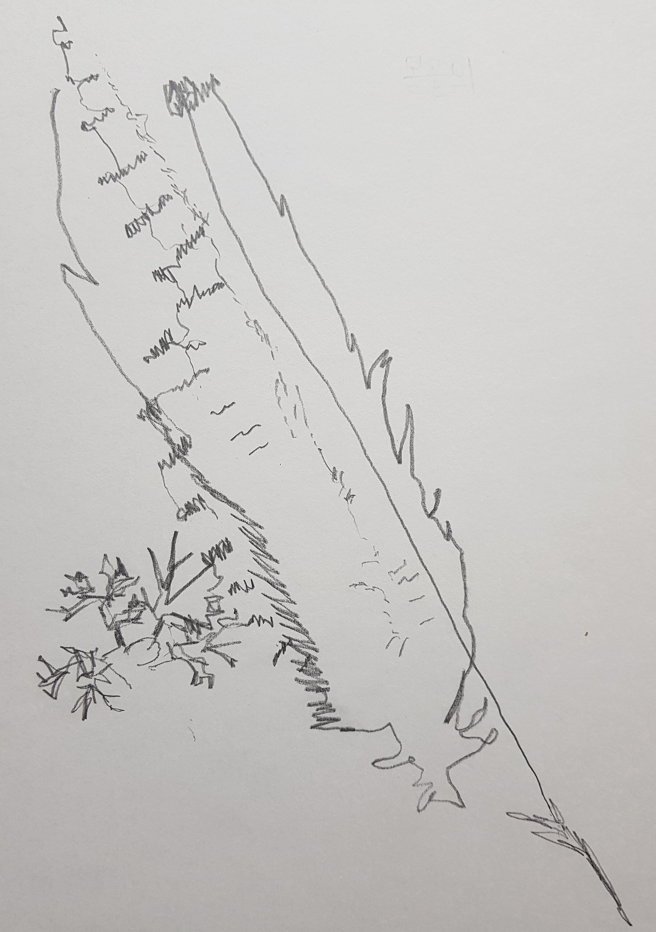 이것은 무슨 그림일까? 뭔지는 잘 모르겠는데 일단 보이는 데로 그려보자. "이 선은 이 쪽으로 굽었네", "이 선은 종이 외곽선과 30도 정도 각을 이루는 것 같아" 와 같이 단지 선만을 관찰한 대로 따라서 그리면 된다. 아래의 그림은 내가 수업 시간에 이러한 방식으로 그린 것이다. 그 밑에 있는 2주 전 수업 첫 시간에 그린 그림과 비교해보면 거꾸로 그리기의 효과를 실감할 수 있을 것이다.