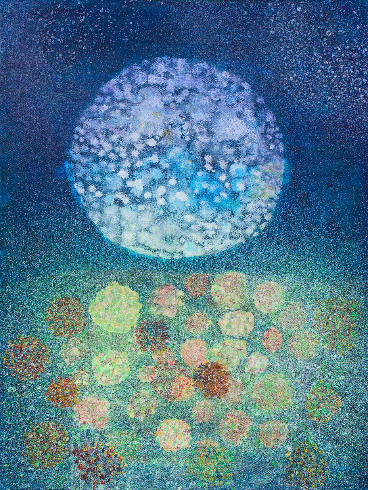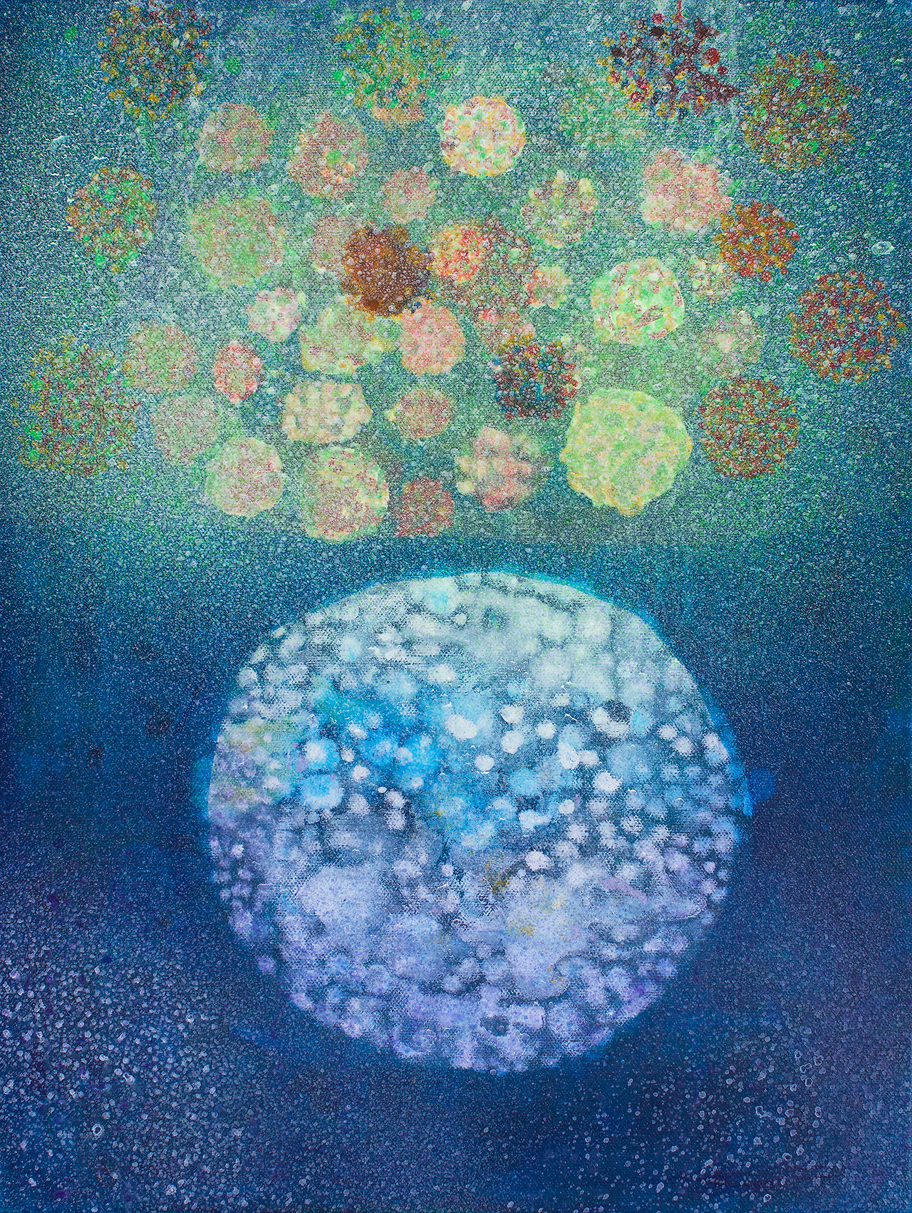 같은 방식으로 꽃도 그리려고 했으나 생각만큼 잘 되지 않아 붓으로 찍어 완성했다. 사실 번지기는 종이와 같이 물을 잘 흡수하는 재료 위해 사용해야 하는 기법이다. 내가 사용한 면 캔버스는 물을 잘 흡수하지 않아 번지기 기법을 사용하는데 어려움이 있다. 그리고 최근에 알게 된 것인데, 물과 물감의 비율을 잘 조절하면 캔버스 위에서도 번지기 기법이 가능하다. 물론 종이에 하는 것과는 효과와 느낌이 다르다.