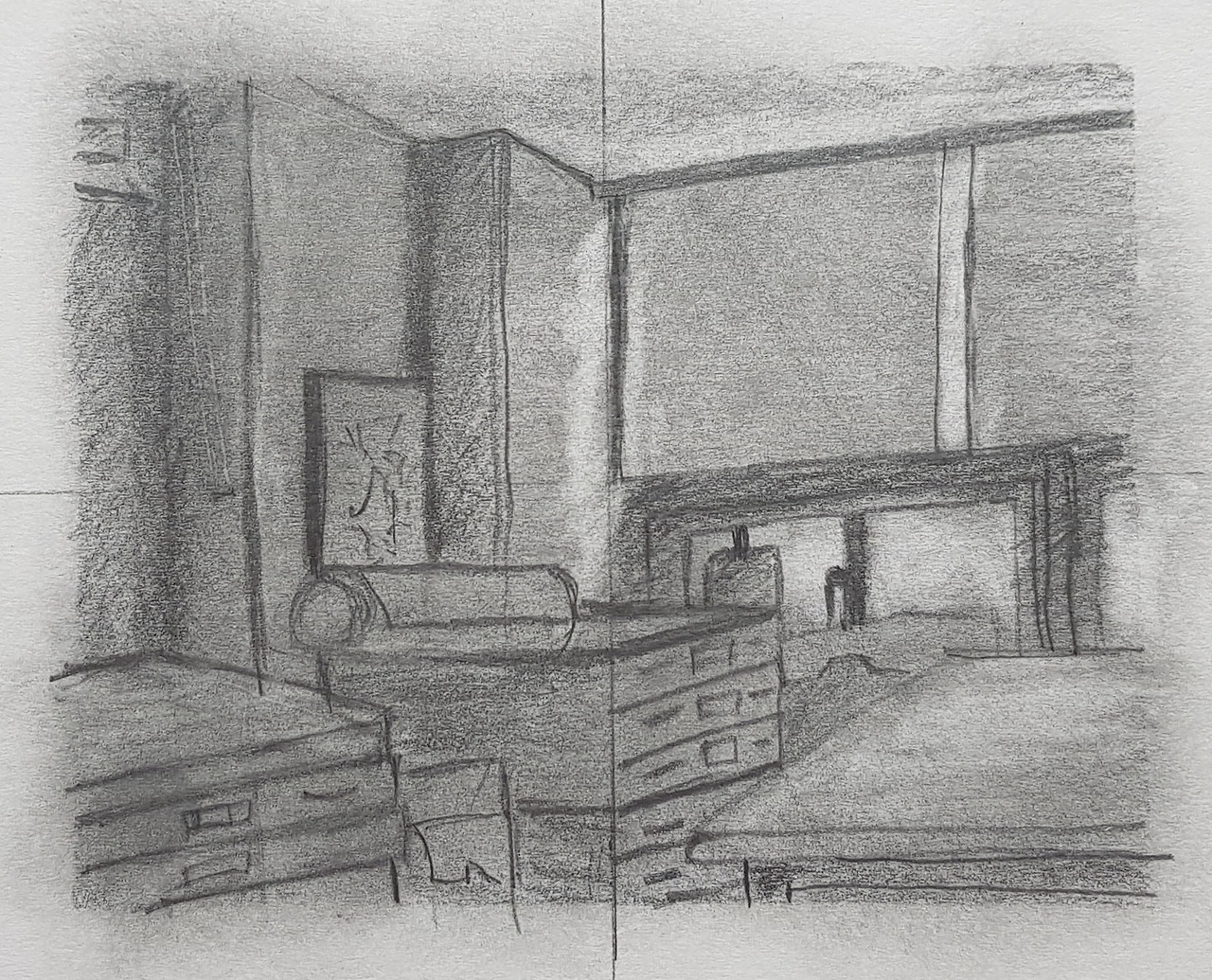 스케치나 데생을 할 때 측량을 하듯이 팔을 쭉 벗은 상태에서 연필을 이리저리 움직이는 모습을 본 적이 있을 것이다. 이것은 대상의 상하좌우 비례와 각도를 측정하기 위한 행동이다. 비례와 각도만 잘 맞아도 그림이 한결 사실적으로 보인다. 그렇기 때문에 우리가 아는 데로 가 아니라 실제의 형태를 관찰하고 비례를 측정하여 그리려고 하는 노력이 중요하다. 아래 그림은 수업 첫날과 1달 반 정도 지나서 화실 안의 풍경을 그린 것인데, 비교해 보면 십자선이 그어진 판과 연필만 잘 사용해도 그림이 얼마나 사실적으로 변하는지 알 수 있을 것이다.