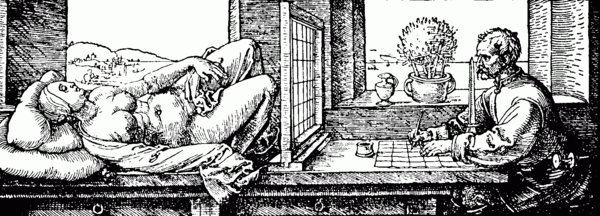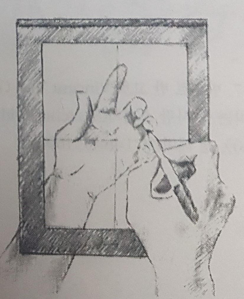 사실 화가들도 우리가 상상하는 것과 달리 옛날부터 구도를 잡고 밑그림을 그리는데 도구를 활용해 왔다. 16세기의 위대한 르네상스 화가인 알브레히트 뒤러는 3차원 물체를 2차원 평면 위에 옮길 수 있는 도구를 발명했다. 아래의 그림처럼 화가 앞의 탁자 위에는 격자 철망과 똑같은 크기의 격자 표시 종이가 놓여 있는데, 화가는 이 철망을 통해서 정확한 각도, 굴곡, 선의 길이 등을 수직·수평선과 비교하면서 그가 지각한 것을 종이 위에 그린다. 만약 자기가 본 것을 그대로 그린다면 비례나 형상, 크기 등은 우리가 알고 있는 실제 인체와는 다르다. 따라서 본 그대로, 즉 사실과 다른 비례대로 그리게 될 경우에만 그림이 실제와 같아진다. 이것이 르네상스 이후 화가들이 입체적인 공간을 평면에 나타내는 데 사용했던 원근 투시법의 원리이다.