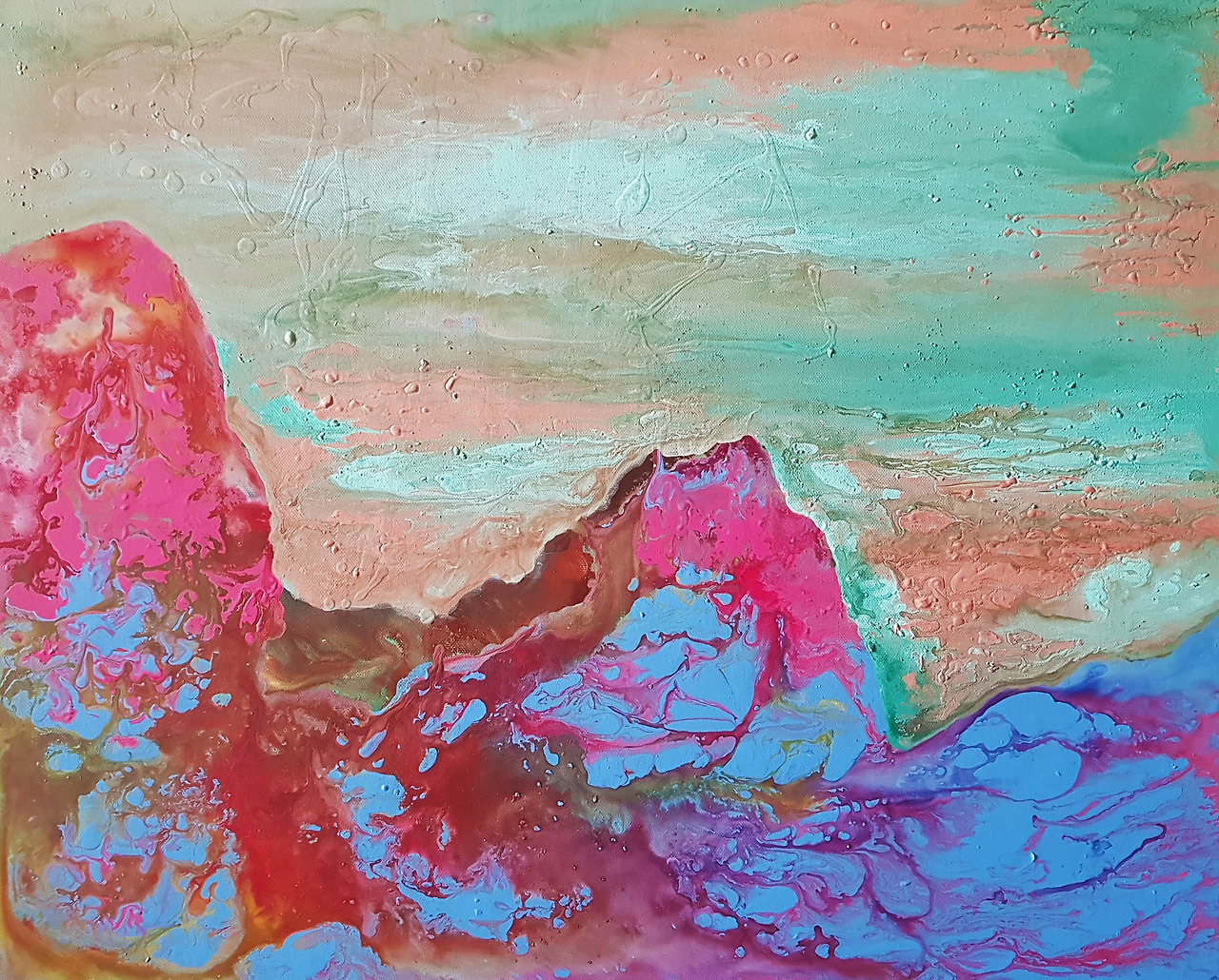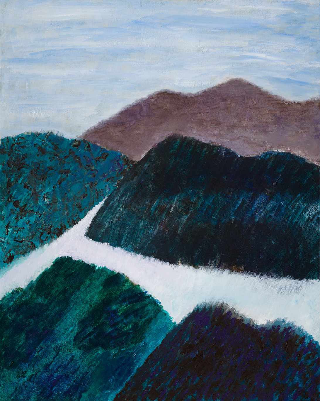 가장 최근에 완성한 그림이다. 유럽의 어느 눈 덮인 산에 희미하게 날이 밝아오면서 산 봉우리가 붉게 물들기 시작한다. 이 그림은 시작할 때부터 중간 과정까지 어떤 형태도 묘사하려 하지 않았다. 단지 번지기와 흘리기로 폴록처럼 우연적인 이미지만 만들었을 뿐이다. 마지막 순간에 밑의 형태에서 여명의 산을 떠올리고 번지기 기법으로 하늘을 덮었다. 추상의 정의가 현실의 재현을 거부하는 것이라면 이 그림은 추상으로 넘어가는 경계에 있지 않을까?