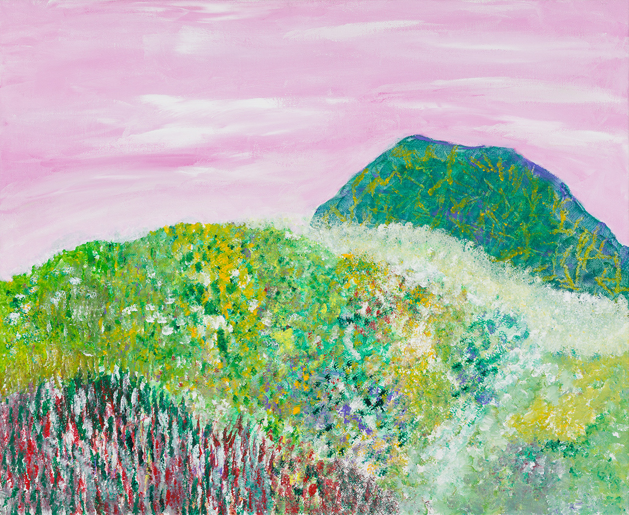 봄의 따스함을 그리고 싶었다. 꽃을 묘사하는 대신 점을 찍어 꽃이 활짝 핀 언덕과 산을 그렸다. 하지만 현실의 파란 하늘로는 따스함을 주기에는 뭔가 부족한 느낌이었다. 하늘을 핑크색으로 처리함으로써 원하는 느낌을 얻을 수 있었다. 이와 같이 실재와 다른 색깔을 사용함으로써 작가의 의도를 더 잘 표현할 수 있다.