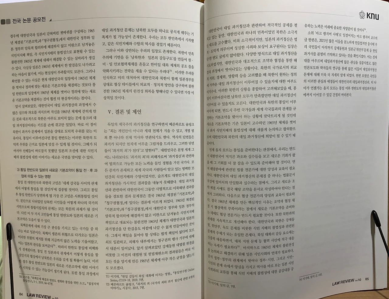 변호사시험 과목 수업이었다면 시험문제는 기본조약이 몇 년에 체결되었는지, 청구권협정은 누가 협상으로 나가 언제 체결되었는지 등과 같은 객관식 문제와 함께 사례형 문제로 배운 내용들을 목차에 맞게 쓰라는 문제가 나왔을 것이다. 하지만, 해당 수업에서 시험은 수업을 듣고 난 뒤 자신이 기존에 알고 있던 지식과 경험에 비추어 짧은 글 하나를 써서 내는 것으로 갈음되었다. 대학에서 통일법을 공부하고, 독일에서 동서독 통일을 법학적 측면에서 연구해 보는 경험을 통해 통일과 통일법에 큰 관심을 가졌던 나는 대일 과거청산을 통일의 측면에서 다뤄보고 싶었다. 그래서 「통일 후 한반도의 대일 과거청산에 대한 법적 연구」라는 주제의 짧은 글을 작성했다.