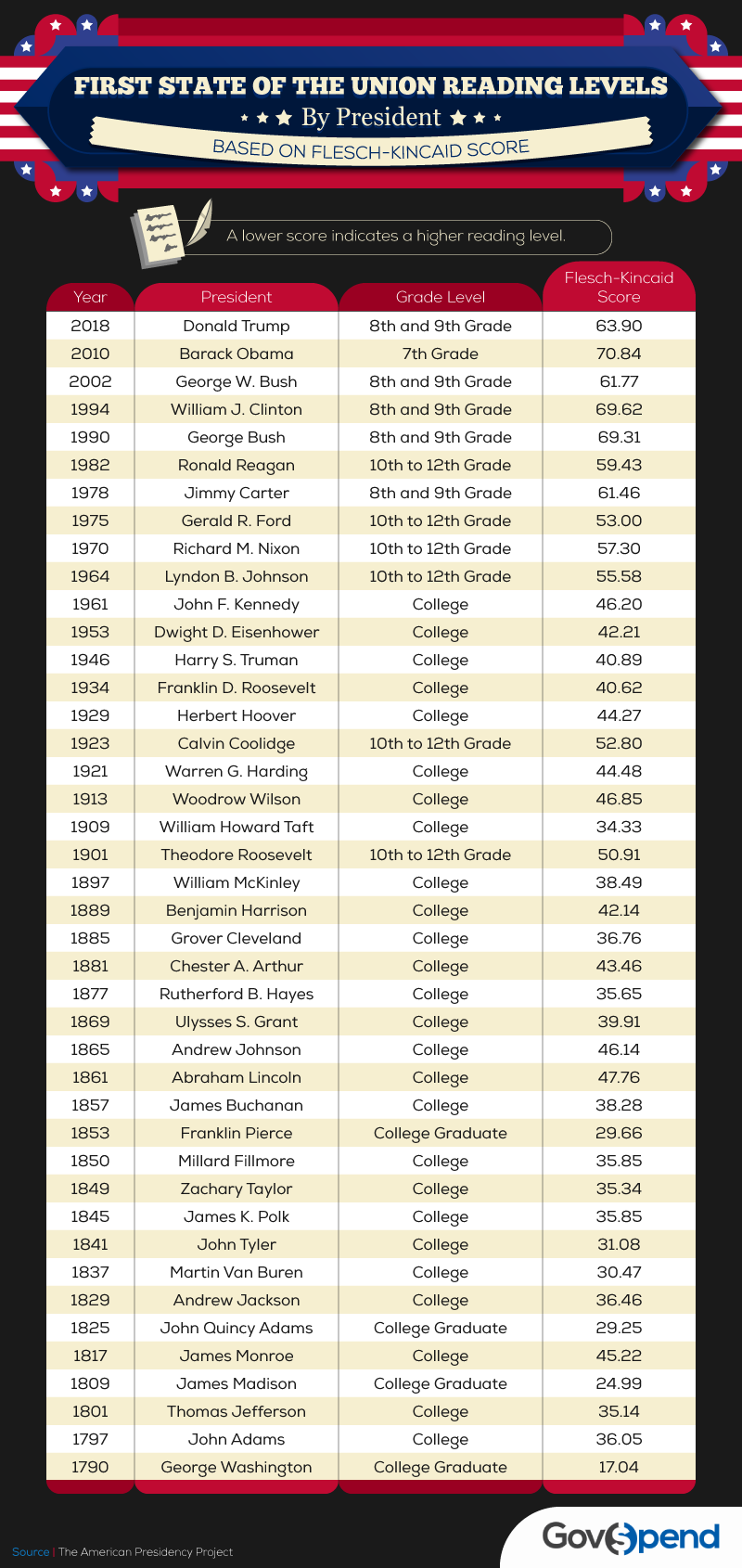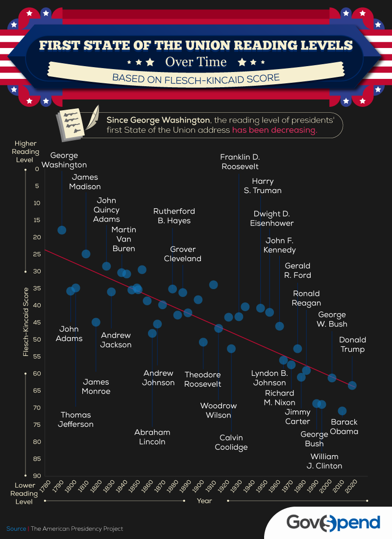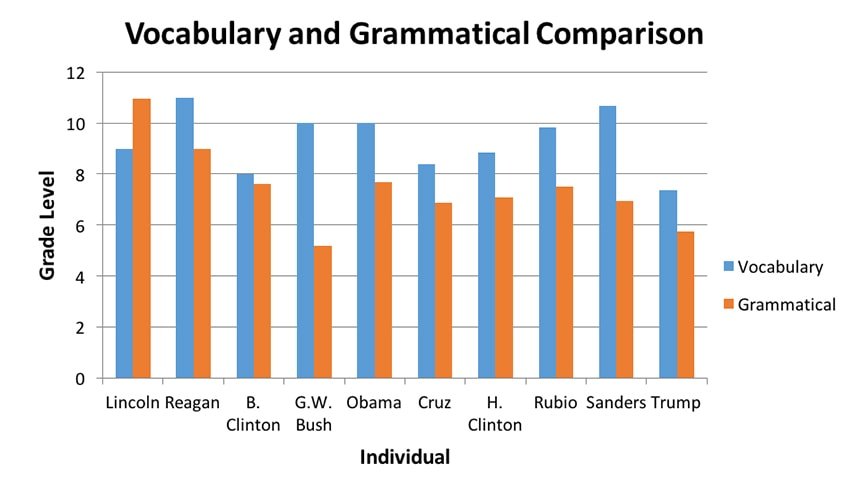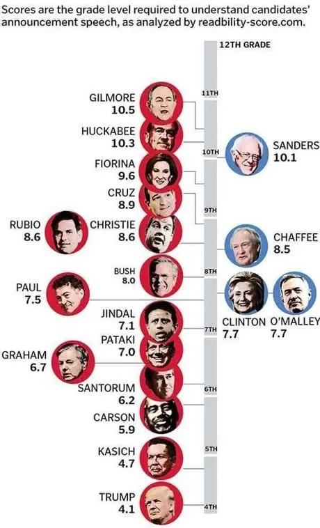 지표와 지수를 담당하는 기관마다 그 수치는 조금씩 다르지만, 한 연구에 따르면 현 미국 대통령인 도널드 트럼프(Donald Trump)가 자신의 '출마 연설'에서 사용한 단어와 문장의 수준은 무려 초등학교 4학년 수준의 어린이가 충분히 이해할 수 있는 수준이었다고 한다. 세계에서 가장 힘센 나라의 대통령은 유려하고 고고한 단어들로 자신의 연설을 채웠을 것이라 생각하기 쉽지만, 충격적 이게도 현 대통령은 우리 나이로 약 11-12살 정도의 어린이가 이해할 수 있는 정도의 연설을 통해 대통령의 자리에 올랐다. 그와 경쟁했던 버니 샌더스(Bunny Sanders)의 경우 중학교 3학년 정도의 학생이 이해할 수 있는 연설로 대중을 만났다.
